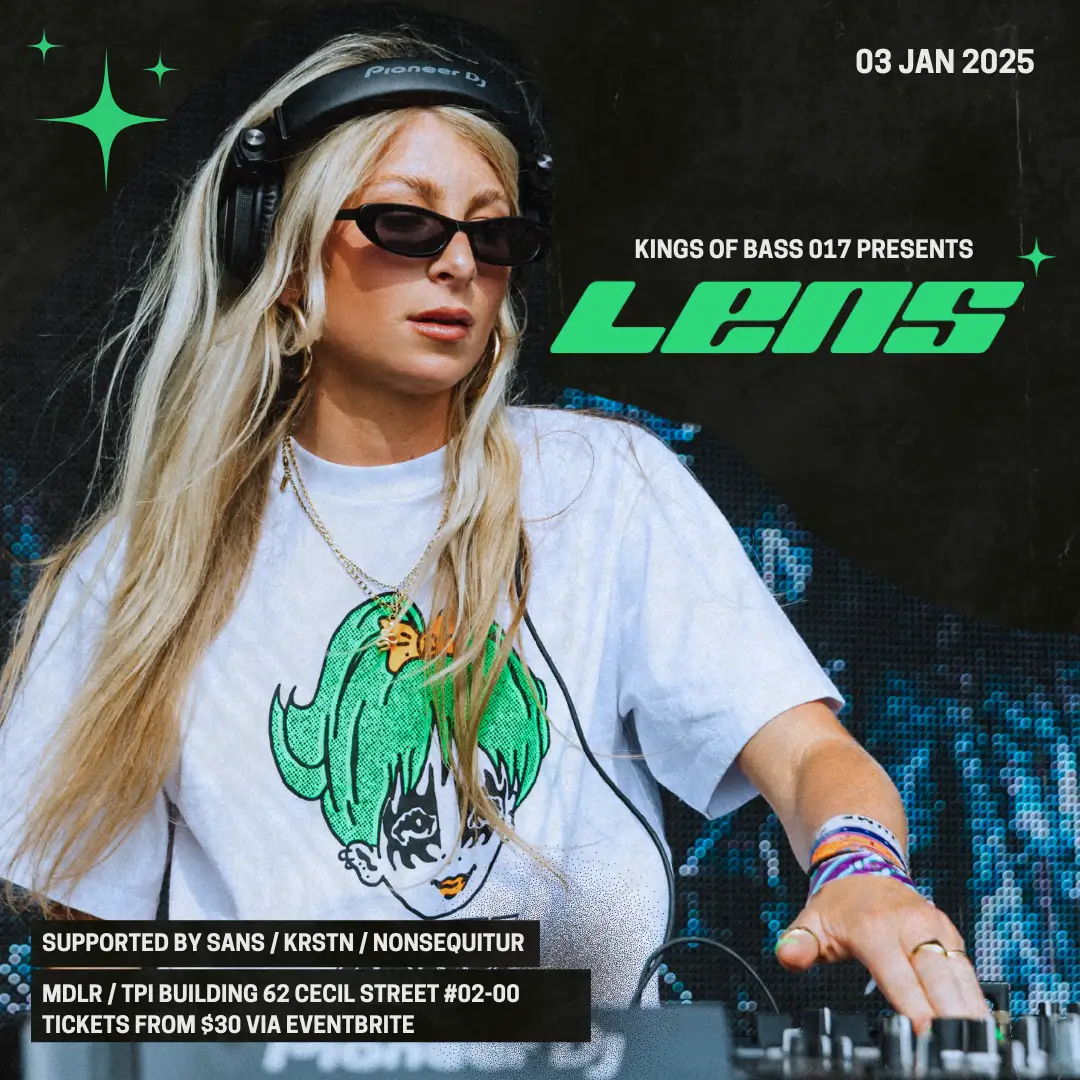 One of the most sought-after drum and bass DJs of 2024 with shows from Drumsheds to Boomtown Festival: catch LENS live in Singapore! The Kings of Bass crew sound di rave alarm as we open the bass gates to welcome the most sought-after Drum and Bass DJs of 2024: LENS (Hospital Records, UK). Gracing our shores again after the sellout Hospitality on Tour show in 2023, this is one show not to be missed. One of Drum & Bass’s hottest new talents, nothing is off limits when Lens is on deck. Her reputation for wild double drops and imaginative, eclectic selections proves beyond all doubt that her headline status is well-deserved. Working her way from the bottom-up, Lens cut her teeth supporting some of the scenes biggest names as well as gradually transmitting her energy and enthusiasm to the airwaves. She was soon scooped up to become the voice of Hospital Records’ Rinse FM show in 2019, not only was she representing the scene’s biggest label on-air, she became a regular name at the world-famous Hospitality events. Curating her own ‘Hospital Records Mixtape’ in 2022 was the start of a breakthrough year for the London-based artist. This included Lens’ debut release ‘Love The Way’ ft Lally, shortly followed by the full-flavoured Spearhead Records EP ‘Marufo’ which revealed Lens’ passion for fusion and deep roots. Going from strength to strength in the studio, Lens is building up her release repertoire and working with some of the most exciting names in the scene such as Pola & Bryson, Unglued, Whiney, Goddard and many more. Her relentless DJ schedule sees Lens delivering her explosive sets from clubs to festivals across the UK, Europe, Australia, New Zealand and Asia.