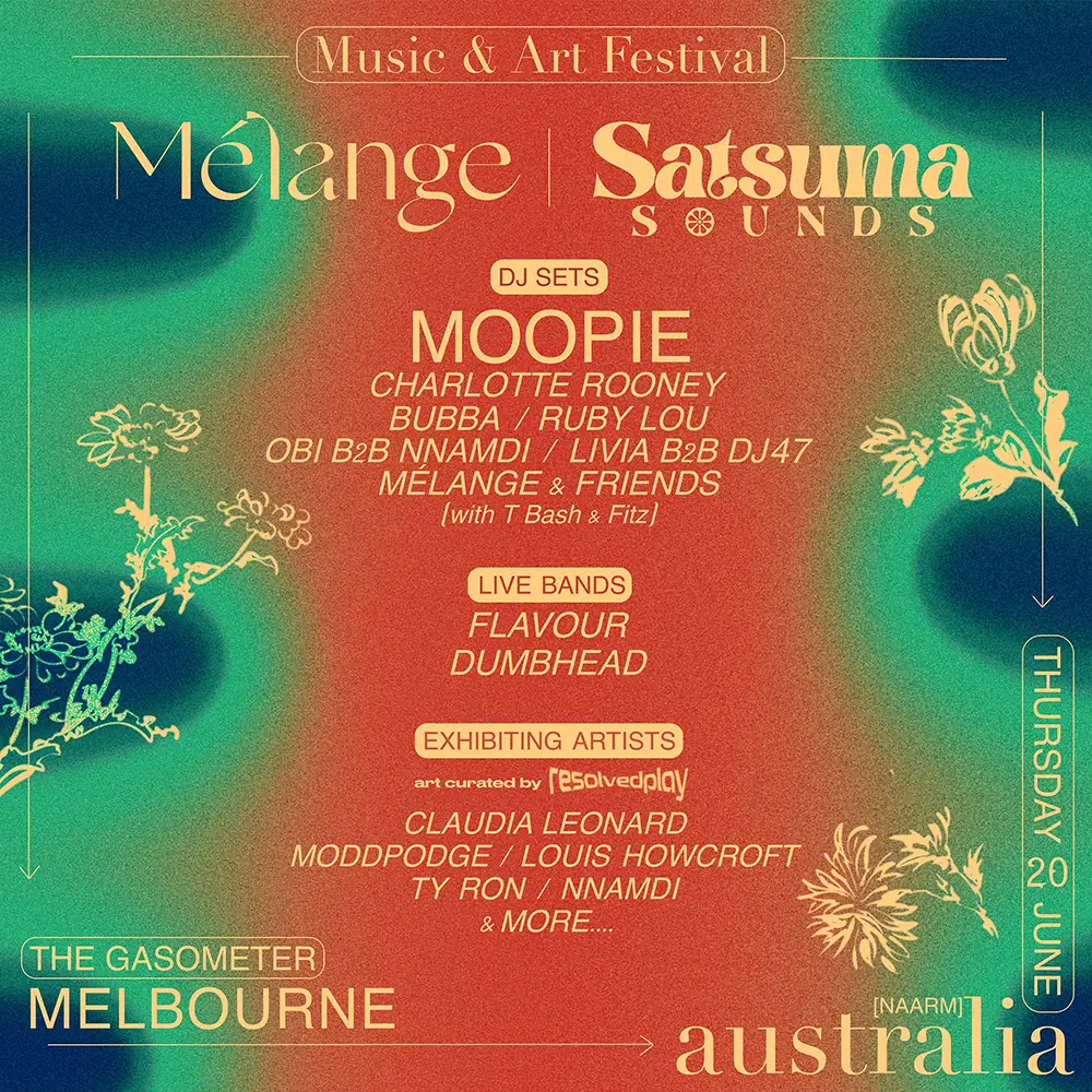 Mélange, a Linkedin equivalent for artists and Scottish veteran party holders 'Satsuma Sounds' team up for a day of Music and Art Celebration at the Gasometer. With an Art Exhibition curated by ResolvedPlay demonstrating the best visual, graphical and musical talent Melbourne has to offer expect a night of high quality music from Bands, DJs and more. Mélange is a start-up platform that acts as an intermediary between visual, digital, musical artists and labels, agencies- an online social media network for artists to showcase digital portfolios and collaborate with other appealing creators. The site is free for anyone to join. Satsuma are an established Scottish Collective hailing from Edinburgh who have hosted an array of UK talent across the island and now embark on a journey to Melbourne. Having previously seen the likes of Sammy Virji, Y U QT, and takeovers at the infamous FLY Open Air festival expect a highly curated, highly talented lineup of Naarm talent.