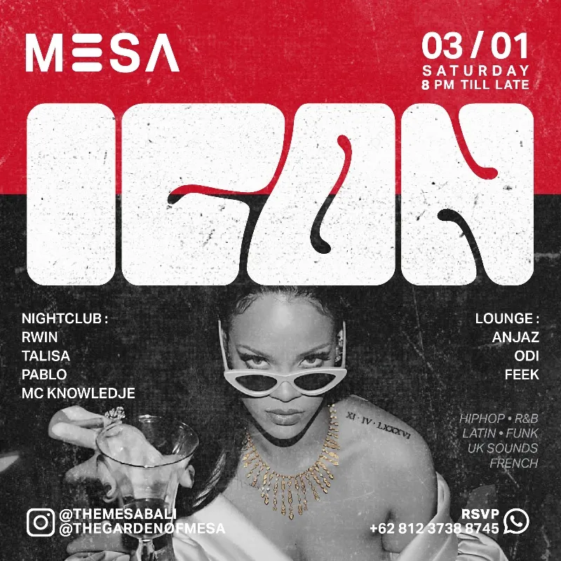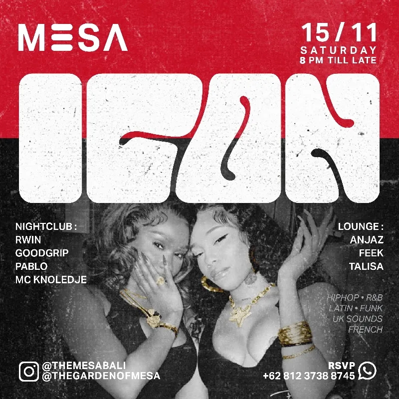 MESA proudly presents, 𝗜𝗖𝗢𝗡 𝗦𝗔𝗧𝗨𝗥𝗗𝗔𝗬𝗦 🪩 Where worldwide hits meet Bali nightlife energy. Experience a global soundscape blending Hip-Hop, R&B, Latin, Funk, UK Sounds, French and global hits that will get the dancefloor jumping. > Book your table before midnight and enjoy complimentary canapés — served fresh daily. > Twin Bottle Deal: Double up, turn it up! Register now on Megatix for free entry before midnight. After 12 AM, FDC 250K applies (includes 1 drink). ⚠️ Guest List valid for one time entry (No Re-entry for Guest List holder) Book your table through our official website 𝙩𝙝𝙚𝙢𝙚𝙨𝙖𝙗𝙖𝙡𝙞.𝙘𝙤𝙢 It’s time for you to be an ICON!