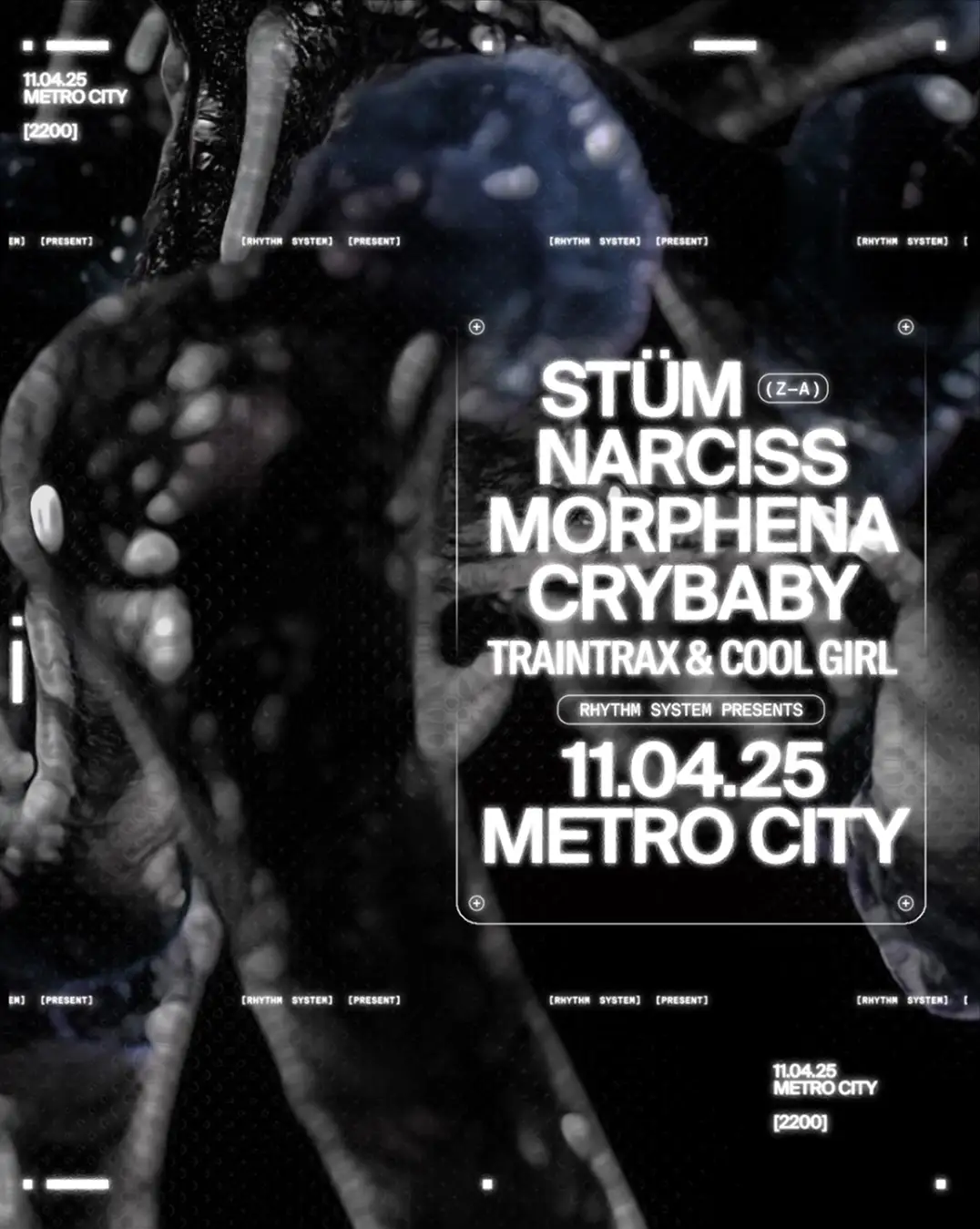 Rhythm System returns for its largest show yet; this time featuring STÜM, NARCISS, CRYBABY & MORPHENA at Metro City April 11th! ꕥ ARTISTS ꕥ ~ STÜM (Naarm/Melbourne) ~ NARCISS (Germany) ~ MORPHENA (Germany) ~ CRYBABY (Naarm/Melbourne) ꕥ SUPPORTS ꕥ ~ TRAINTRAX ~ COOL GIRL ꕥ TICKETS ꕥ Tickets on sale 4th March 2025. Sign up for exclusive early access → ꕥ SOCIALS ꕥ FB: /Rhythmsyst3m IG: @Rhythmsyst3m ꕥ ARTWORK ꕥ Instagram: @oldearth.design ꕥ RESPECTS ꕥ We would like to acknowledge the traditional owners of the land on which this event is taking place, the Whadjuk people of the Noongar Nation. We acknowledge the continued contribution they make to culture, lands & waters. We pay our respects to their elders past, present & emerging. Rhythm System pride themselves on being a safe space. We encourage free & open expression. Please respect others & their boundaries