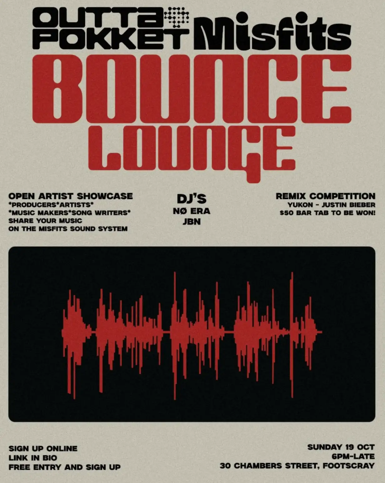 🎛️ **NAARM MUSIC MAKERS — TAP IN!** 🎛️ **Bounce Lounge** is back for Round 2! A community link-up for producers, songwriters & artists to connect, vibe & play music on the **Misfits Sound System** 🔊 **Share your tunes** **Find collabs** **Get feedback** **Just nerd out & make music friends** 💿**ARTIST SHOWCASE** Step up & play 2 mins of your original music LOUD on the system. 🏆**REMIX COMPETITION (NEW!)** Grab the stems, flip them in any genre, keep it under 2 mins, and use the vocal sample. Winner gets a **$50 BAR TAB** + bragging rights All entries played on the system. 🌀 DJs @jbn.mp3 and @no_era__ on warm-up & cool-down duties — spinning bounce + exclusives all night. 🆓 **FREE ENTRY** 📝 **FREE SIGN-UP** Music makers + music lovers = all welcome. 📍 **@misfits.space** 🗓️ **Sunday, Oct 19** 🕕 **6PM ‘til late** 🔗 Sign up via link in Bio! Remix stems provided through registration. Any questions, feel free to DM