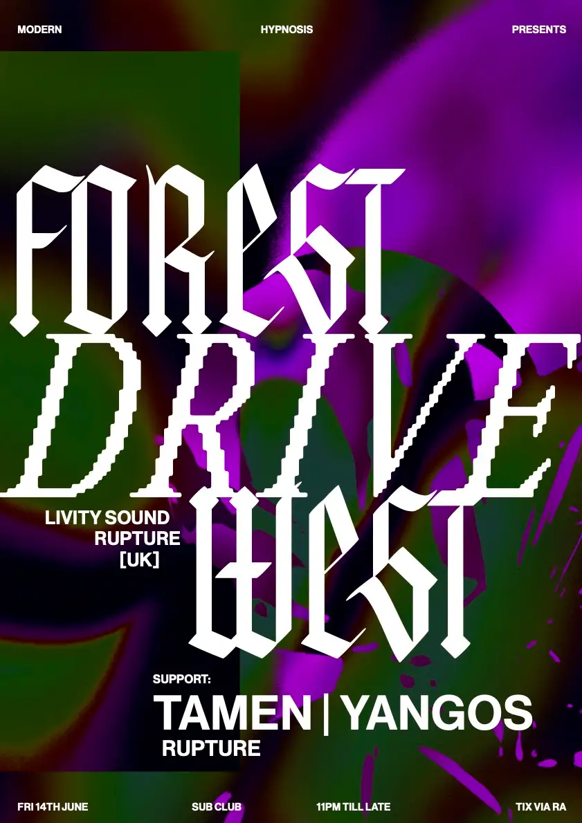Modern Hypnosis presents the long-awaited Naarm debut of London-based UK Techno, Jungle and DnB producer Forest Drive West. Since 2016 His music has been released on esteemed labels Livity Sound, Rupture London, Ilian Tape, Echochord, Hidden Hawii, Delsin, Midgar, R &S Records and more. Joining the line up we have Tamen and Yangos. Tamen, a Naarm-based Bass & Jungle/DnB producer and DJ who has released music on labels like Rupture, 3024, and Dext. Yangos, a purveyor of deep sounds and selections, director of Naarm's new Kast agency, and part of the bass music focused duo Strange Interactions. Expecting a big one! ------------------------- We acknowledge the traditional custodians of the land this event is taking place upon, the Wurundjeri People of the Kulin Nation, and we pay our respects to their Elders of past and present. -------------- Sub Club uses Scantek Technology to enhance their security measures and to deter anti-social crowds from entering. Please bring VALID PHYSICAL ID is required to guarantee entry to our events. Arrive at the club and have your ID ready to be scanned.
