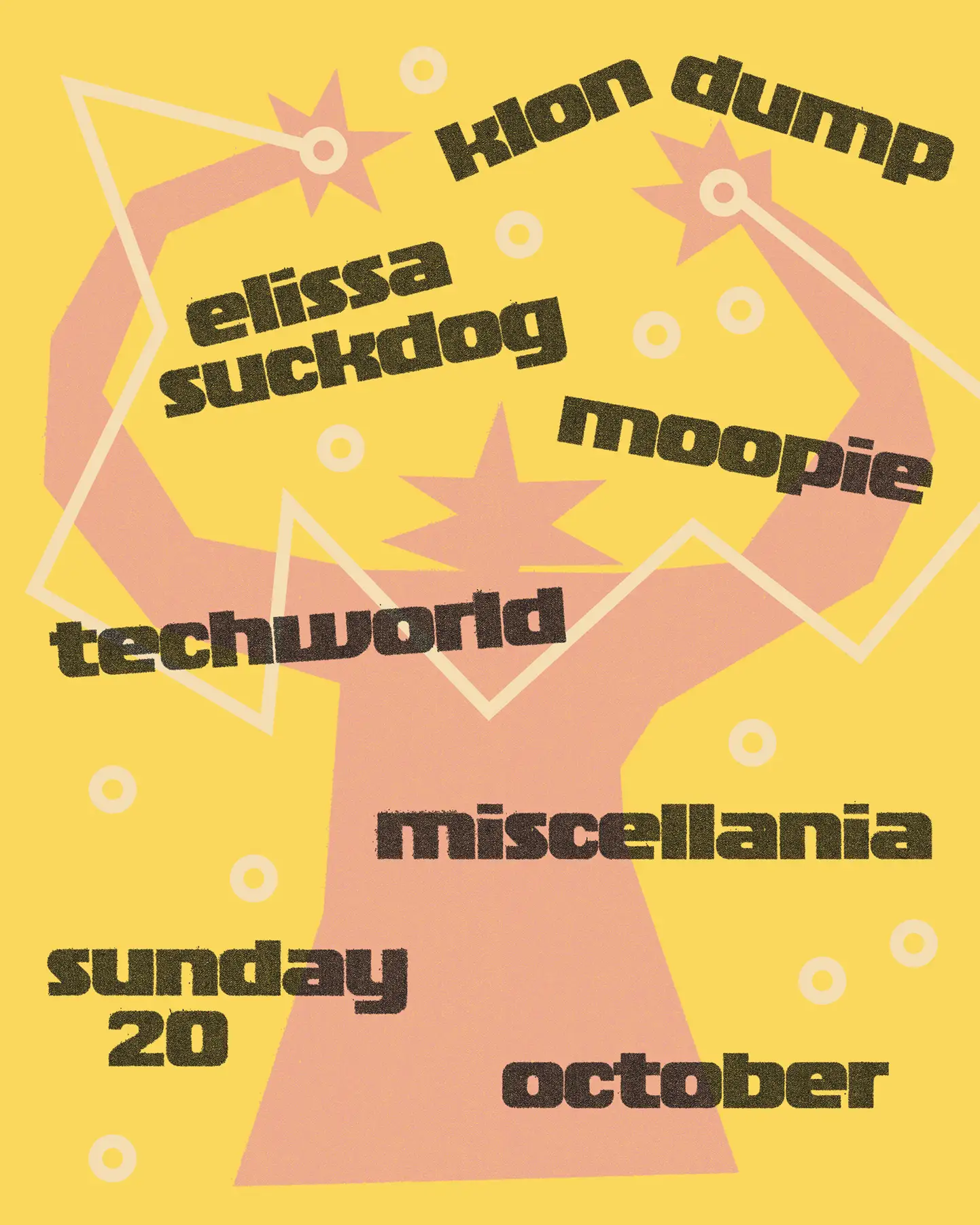 Moopie, Klon Dump, Elissa Suckdog and Techworld return for the start of Miscellania's Sunday season! ♡ Free entry 2pm - 4pm ♡ Happy hour 2pm - 4pm ♡ Pop-up food stall on the rooftop 4pm - 8pm Accessibility info in ticket link This event is held on stolen land of the Woiwurrung and Boonwurrung peoples of the Kulin Nation. Free entry is offered for all First Nations - please email info@miscellania.club for any enquiries