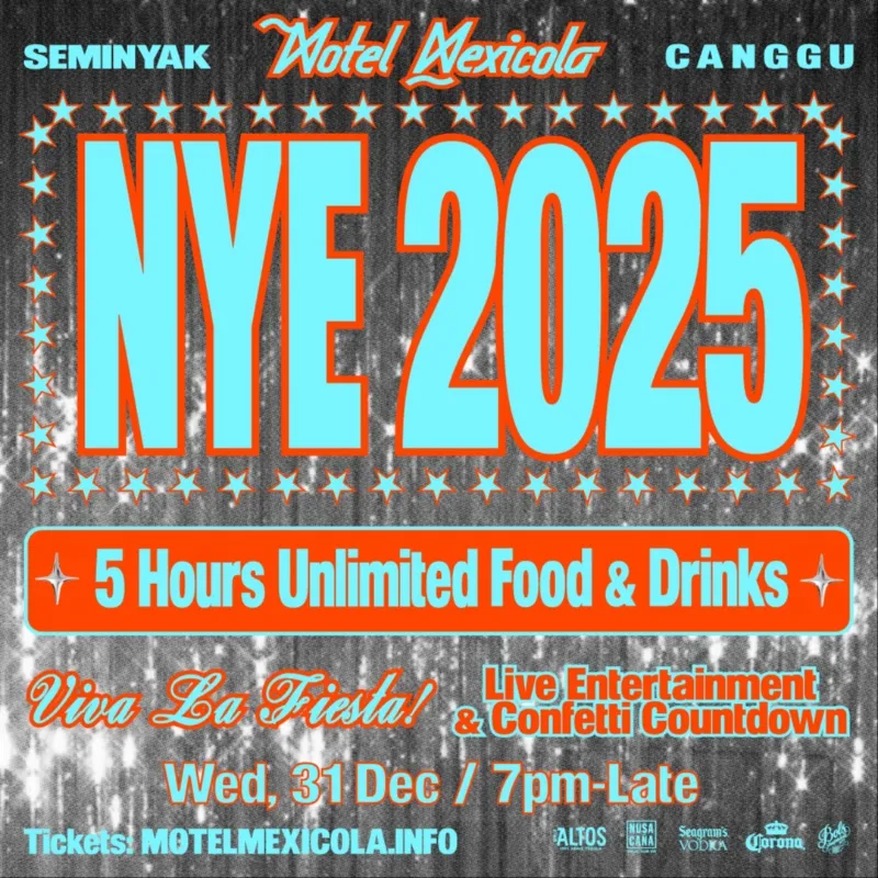 MOTEL MEXICOLA SEMINYAK & CANGGU NEW YEAR'S EVE 2025 FORGET RESOLUTIONS. REMEMBER THE FIESTA Just like the rhythm of a mariachi band, Motel Mexicola’s legendary New Year’s Eve is blasting back, louder, wilder, and this time across two venues: Seminyak and Canggu. One night, two casas, endless fiesta to carry you straight into 2026. From 7PM to midnight, dive into 5 hours of unlimited food and drinks, with every bite, and beat designed to fuel your night. Think bold flavours that dance on your tongue, colours that electrify your senses, and an atmosphere so alive it stretches from Seminyak all the way to Canggu. VIP TABLES AVAILABLE. Skip ordinary. Go VIP. Celebrate at your own table, right in the eye of the Mexicola storm, champagne chilled, bottles ready, your crew in the spotlight. This isn’t just about skipping lines or securing space. It’s about owning the night. This isn’t just a countdown. It’s a declaration. A night for amigos, for music and for Mexico. Raise your glass, kiss your neighbour, and shout it loud: ¡Viva la fiesta, viva 2026! Tickets on sale now for Seminyak. Earlybird ends 31st October. Don’t miss it, amigos! TICKET TERM & CONDITIONS : GA tickets are for entry only and do not include reserved seating. VIP Table packages include entry tickets for a set number of people and a reserved seating area. The event is strictly 18+. ID will be required. Tickets are non-refundable and non-transferable to other venues. Tickets are only valid for the venue purchased, there will be no ticket swapping between venues. Entry is for ticket holders only – No Ticket, No Entry. Management reserves the right to refuse entry. Dress code: No singlets or alcohol-branded shirts. Motel Mexicola prohibits any violent act, threat of violence, or harmful behaviour.