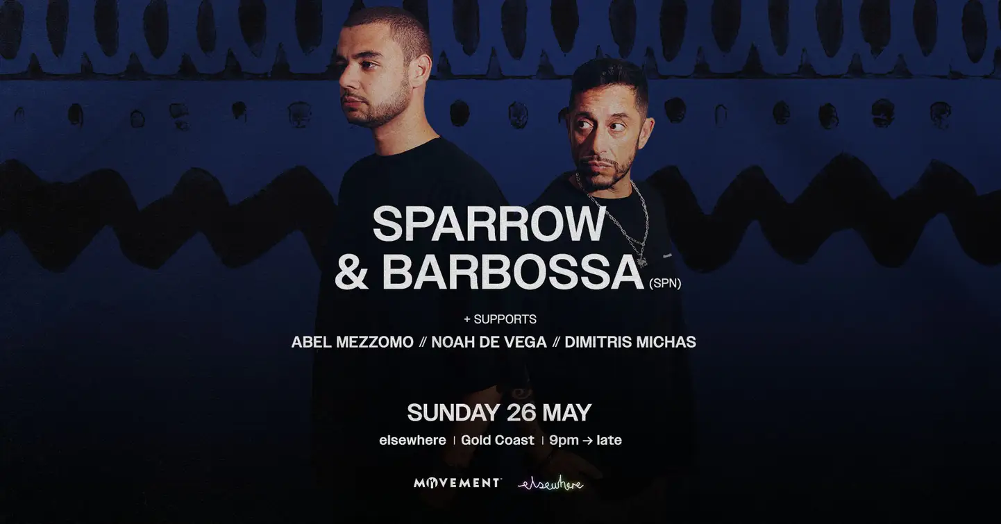 Saturday, May 26th, marks our next installment at Elsewhere. For this occasion, we've assembled a lineup showcasing the best of Afro-House and Tech. Featuring internationally renowned artists Sparrow & Barbossa (ESP) supported by local talents. Strap in for a night of pulsating rhythms as we run from 9 PM to 3:30 AM. Sparrow & Barbossa (Spain), known for their chart-topping hits under labels like MoBlack Records and Innervisions; this pair has taken the Afro House scene by storm with their soulful music and undeniable energy. After some livewire performances at the Eka festival & several venues from Ibiza to Tulum, Sparrow & Barbossa look to bring their groovy rhythms to Australia on their debut tour.