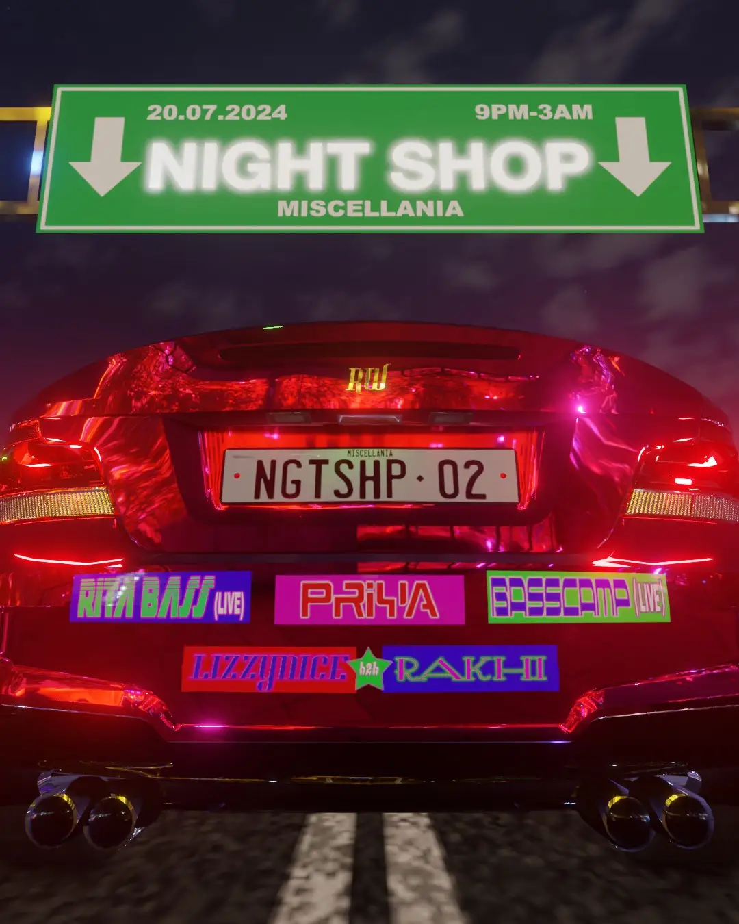 “Babe get in! We’re going Night Shopping…” Rakhi’s colourful Night Shop returns for a second round of assorted delights. Strap in for two live sets from tech house wizards Basscamp and low frequency queen Rita Bass, plus DJ sets from the eternally playful priya and a b2b between big dog Lizzynice and shopkeeper Rakhi. Pull up to satisfy your late night cravings, or find something you didn't know you needed. Night Shop is a space for eclectic, leftfield, bass & riddim-focused music. For the unserious and silly, for the forward-thinking artists who don’t want to play it safe. More of the wonky tunes and stoopid dance moves. Centering free self-expression, variation and creativity, Night Shop prioritises BIPOC, queer, femme & GNC artists, as well as local producers. Lineup A-Z: Basscamp (live) Lizzynice b2b Rakhi priya Rita Bass (live) Night Shop exists on unceded Wurundjeri Land. We pay our deepest respects to Wurundjeri elders past and present. Always was and always will be, Aboriginal Land. Free entry for First Nations people.
