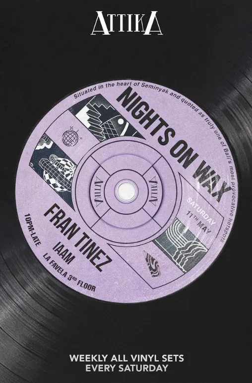 Indulge in the ultimate nightlife experience at Attika Bali with "Nights on Wax" DJ night! Join us every Saturday for a journey through vibrant beats and electrifying tunes. From 10pm until late, groove to the sounds of Fran Tinez and IAAM as they spin the latest tracks and classic favorites. Get ready to dance the night away in the stylish atmosphere of Attika Bali, where every beat will keep you moving until the early hours of the morning. Don't miss out on the excitement and energy of "Nights on Wax" - it's the perfect way to spend your Saturday night!