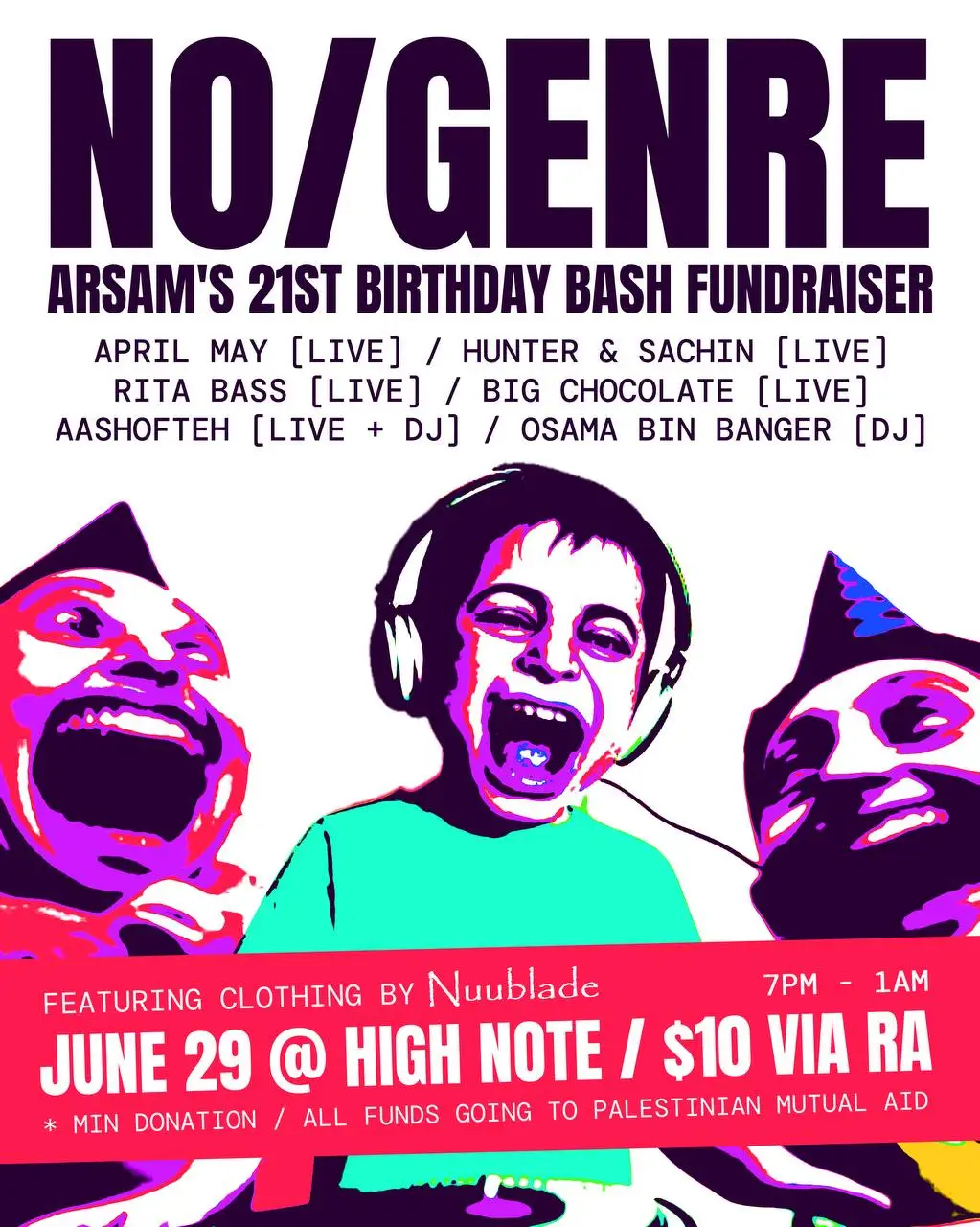 Come on down to High Note on June 29th from 7PM to 1AM for NO/GENRE! A night to celebrate community, live music, and Arsam’s birthday (obviously). Brace yourself for a folk opener by April May (ft. Dylan Will), improvisation on the Persian setar by Arsam, experimental live sets by Rita Bass and the duo Hunter & Sachin, a live performance by Big Chocolate, and finally, closing DJ sets by both Aashofteh (Arsam) and Osama Bin Banger. The amazing Nuublade will also be selling clothing at the start of the night. What more could you want? All funds going to Palestinian mutual aid, big love to everyone helping out to make this happen Tiered tickets up based on your ability to donate DETAILS Where: High Note Space 2 (Northcote VIC) When: Saturday June 29 (7PM to 1AM)