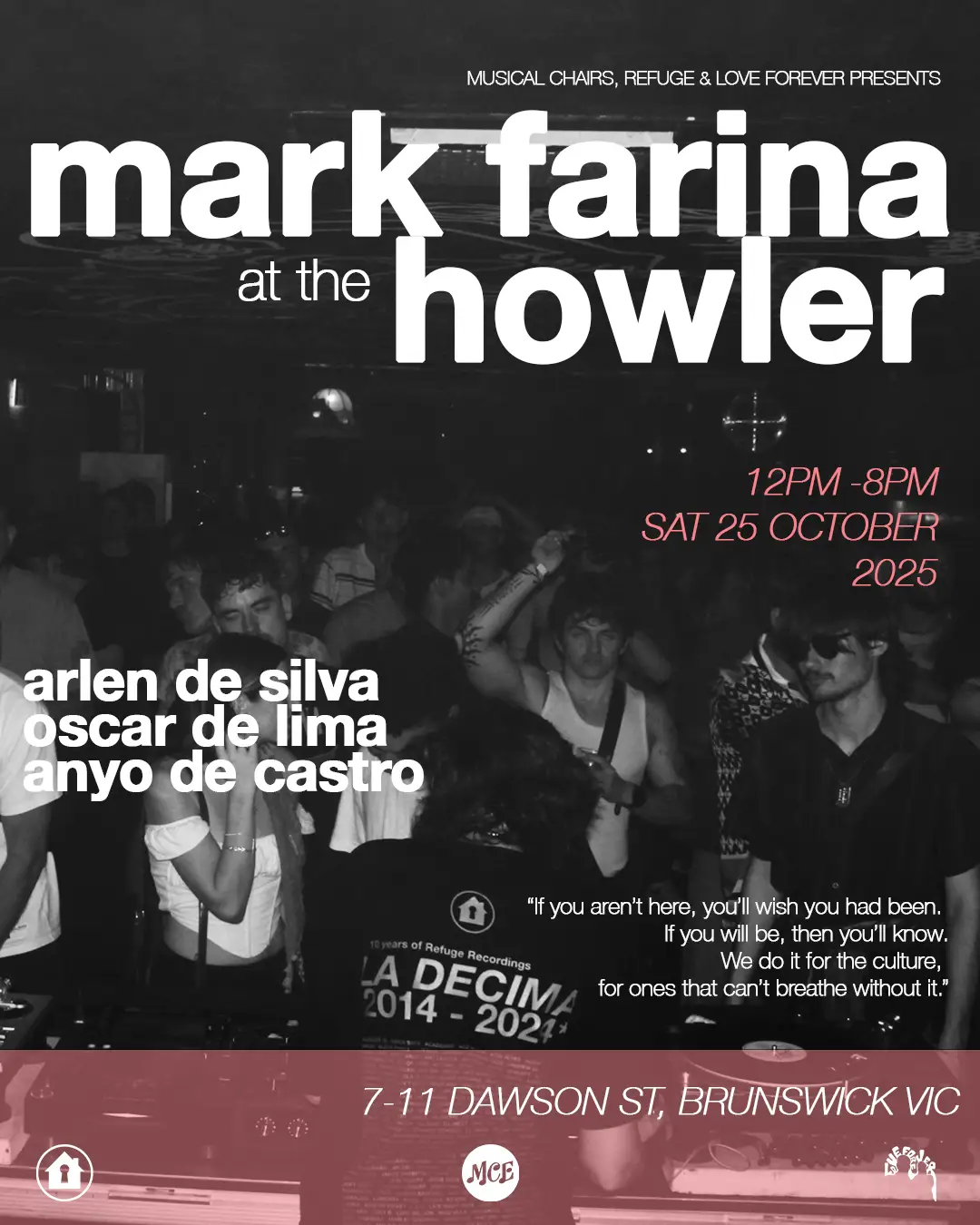 It's not every day you get to host one of the greats. We thought we should recruit some of our favourites to present Mark Farina at the Howler! Expect an awesome day out with open air venue and a house legend! A name that rings out across the entire global dance music industry. His non-stop touring, constant content creation, partnerships with legendary venues and record labels as well as his total commitment to showcasing the best new and old school producers in his sets have made him a living legend to lovers of house and Mushroom Jazz everywhere.