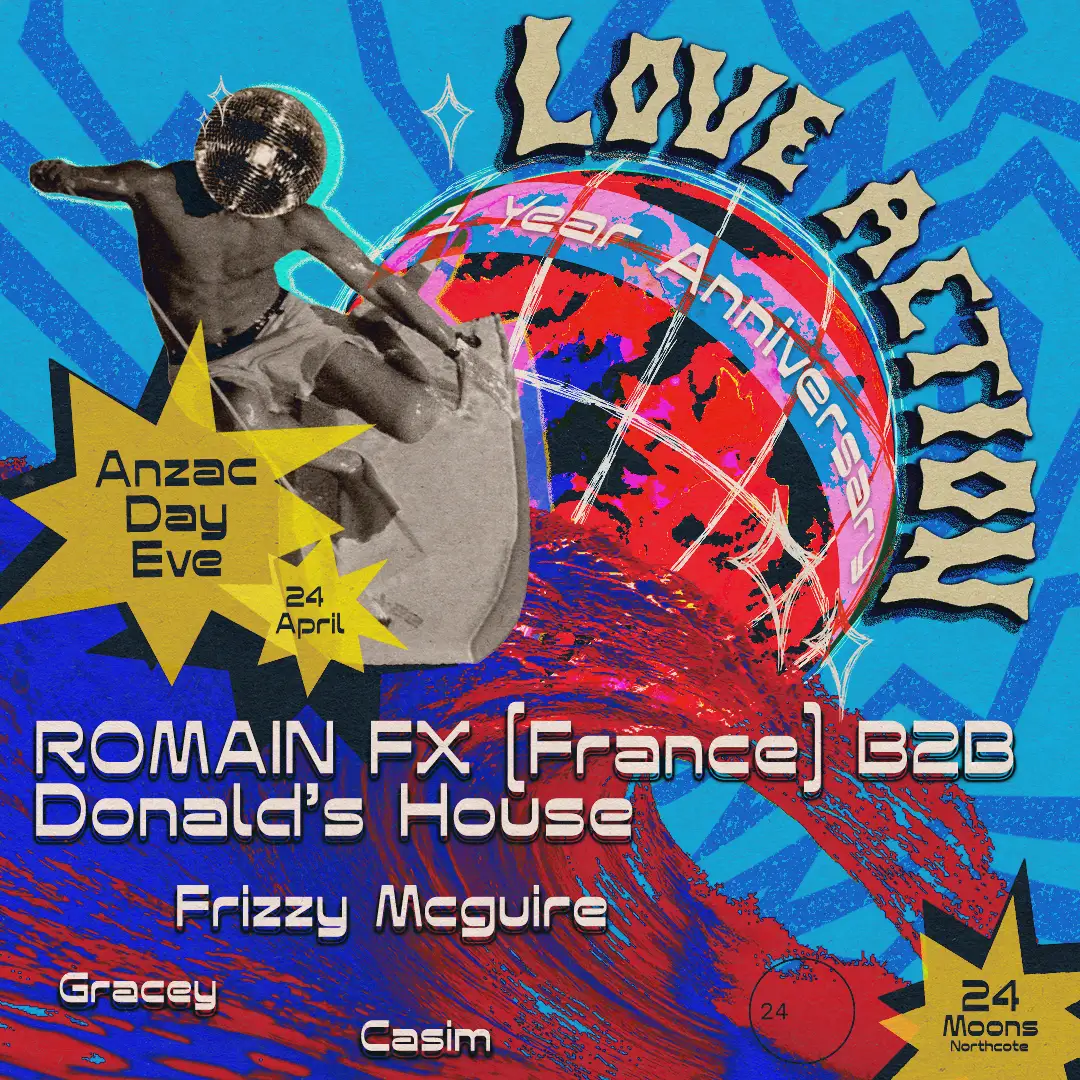 Love Action is a celebration of disco and synth pop sounds from the 80s, visually inspired by the Aussie coast. April 24 marks one year since the launch of our party, and for this milestone of survival we are bringing together two of the most influential artists behind the Love Action sound - local Donald's House, and French based record collector Romain FX.