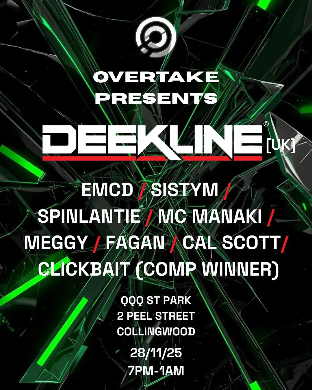 Overtake Events are back for their second party, this time with DJ Deekline from the UK. Expect a night of DNB + Jungle from start to finish on QQQ's insane sound system. Lineup: Deekline [Jungle Cakes] [UK] EMCD Sistym Spinlante Mc Manaki Fagan Meggy Cal Scott Clickbait (Comp Winner)