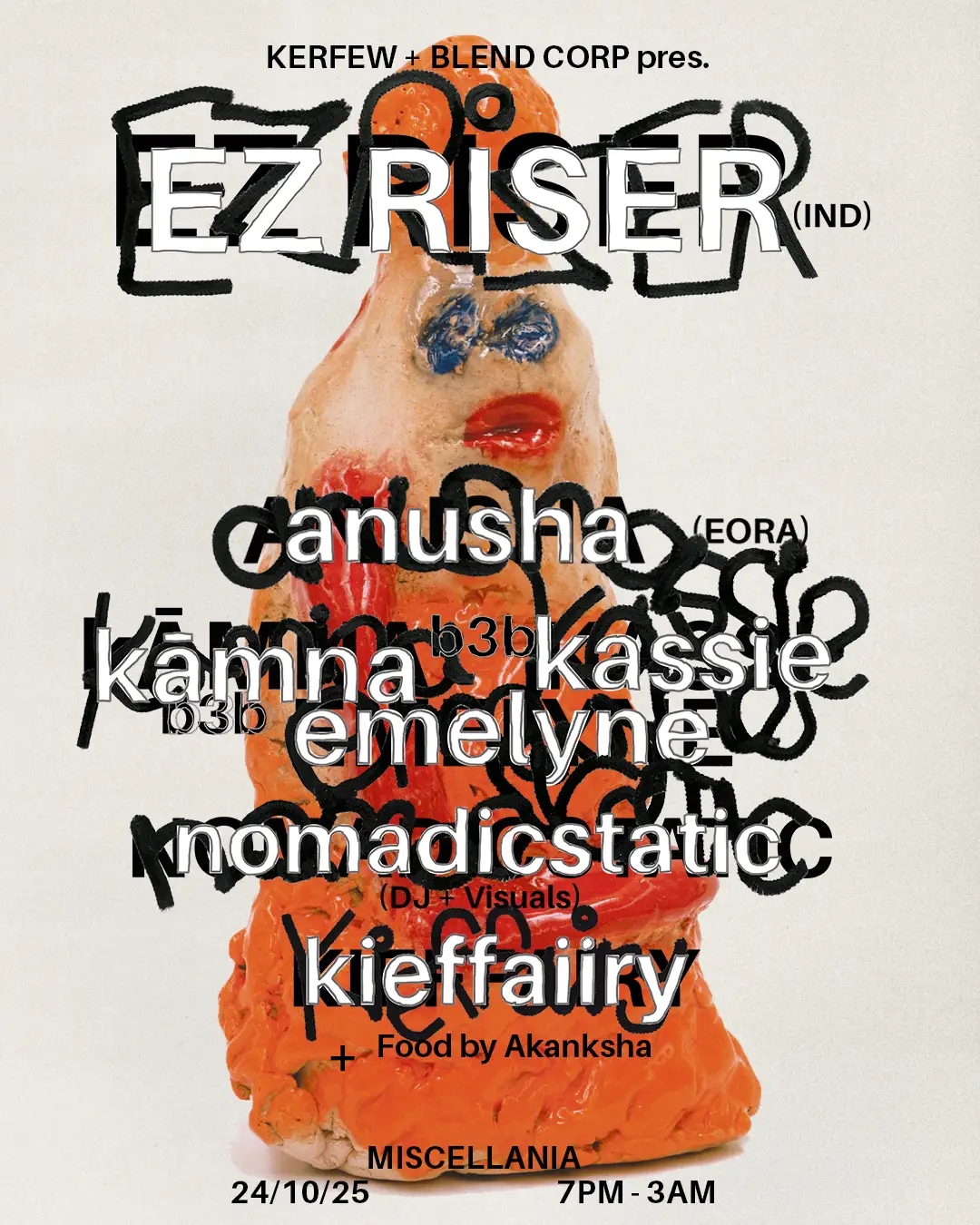 Kerfew is teaming up with local legends of the Naarm bass scene, Blend Corp to present a pioneer of the bass scene in India - the solo project of KRUNK LIVE founder, Sohail Arora ——- EZ RISER. Debuting his career in October 2012, EZ Riser draws inspiration from Jungle, Drum & Bass, Dubstep, Garage, Techno, Acid, Breaks, Footwork, and Global Bass, to engineer his unique sound seamlessly blending genres in every set. Over the past decade, EZ Riser has shared stages with some of the world's finest bass music pioneers, including Coki, Om Unit, D Bridge, Loefah and many more. EZ Riser’s debut EP ‘The Slacktivist’ (2022) marked the arrival of this music veteran in the Jungle and Drum & Bass scene with themes reflecting on online individuals' lackluster support for social or political causes. The rough and rowdy sounds of the EP arise from the artist's reflections on the movement and its place in our culture. Based out of Mumbai, India, Sohail Arora founded KRUNK in 2009. Over the past 15+ years KRUNK has hosted more than 4000+ events, which has put KRUNK at the forefront of live & electronic independent music in the country, hosting artists as far ranging as Squarepusher (UK), Ivy Lab (UK), Mantra (UK) to Fracture (UK). And while Ez Riser, real name Sohail, is a regular at said events, delivering a variety of bass sounds, make sure to catch him playing under his other alias, Rafiki, playing heavyweight techno and house. With a new EP and singles on the horizon, his electrifying music is set to shake things up globally. On supports we have - the Kerfew debut of EORA’s sultry sugary sweetheart Anusha - bass baddie of the west Kieffaiiry - visual artist nomadicstatic on the visual and deck tools - and a never before seen b3b between local brat pack kāmna, Emelyne and Kassie blending up some truly cooked up sounds Food on the rooftop by Akanksha 🩷 7pm - 3am 24 October 2025 ACCESSIBILITY Key points: -Miscellania is inaccessible for wheelchair users. -We have a strict no-strobe policy. Please find additional info on safe lighting here. -First Nations people are allowed free entry to all events. This event will be on the lands of the Wurundjeri Woi-Wurrung people of the Kulin Nation. We pay our respects to elders - past, present and emerging - and acknowledge that sovereignty was never ceded. Always was, Always will be Aboriginal Land. We acknowledge the continuing connection First Nations communities have to music, dance, performance and culture as key aspects of their identity and resilience in the face on ongoing colonisation. FREE PALESTINE, WEST PAPUA, CONGO, SUDAN and END ALL IMPERIAL OCCUPATIONS.