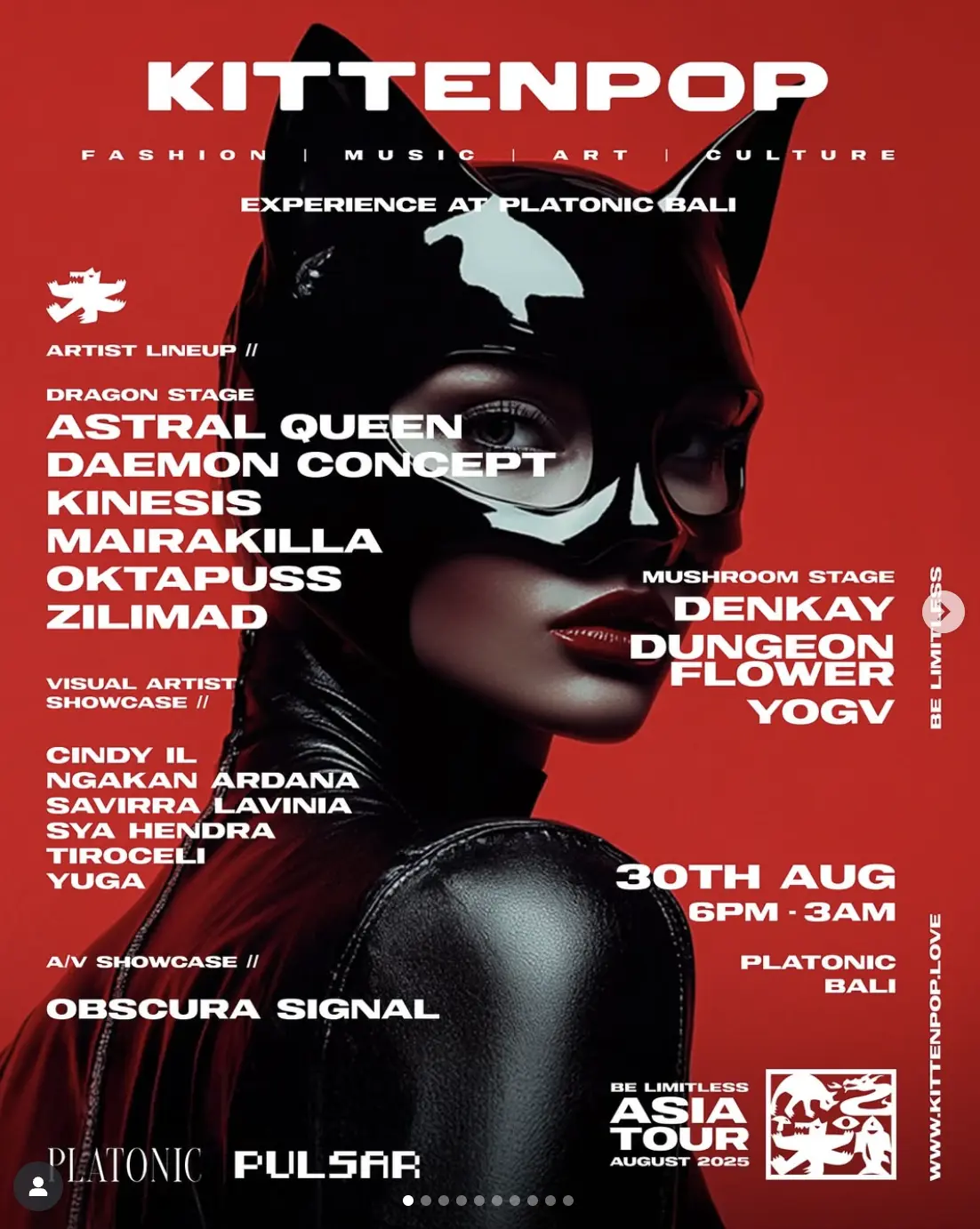📅 Saturday, 30th August 2025 | 📍 Platonic, Canggu | ⏰ 6PM onwards For the first time ever, Kittenpop touches down in Bali — bringing its signature fusion of underground music, live art, fashion, and conscious culture to the island. Known for turning nights into multi-sensory journeys, Kittenpop is more than a party — it’s a movement of radical self-expression, community, and limitless creativity. This debut collides with two of Bali’s most inspiring forces: Pulsar — the island’s underground collective, celebrated for immersive nights of techno, trance, electro, and breaks. Platonic — Canggu’s unconventional venue + intimate community hub, where art, people, and music come alive in a beautifully eclectic space. Together, these universes create a one-night experience unlike anything Bali has seen before — a night where underground beats meet immersive art, where the dancefloor becomes a limitless space of connection.