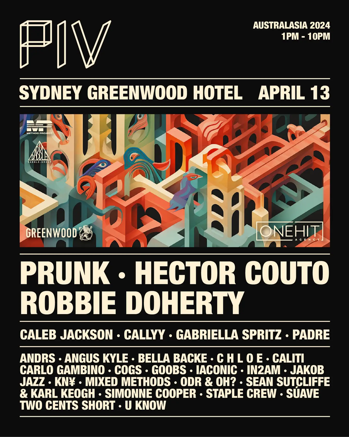 PIV Records returns to Sydney this April Line-up: Hector Couto (ESP), Prunk (NL) & Robbie Doherty (IRE). + supports. The Amsterdam-based house music record label and movement continues to take the world by storm, joining us off the back of a highly successful run of shows throughout the US and Europe. From their lauded Amnesia Ibiza residency to stages at Tomorrowland, Defected Croatia and now their very own flagship PIV festival — Sydney is up next, and we're taking it back to where it all started for the brand for an open-air, day-to-night affair at Greenwood.