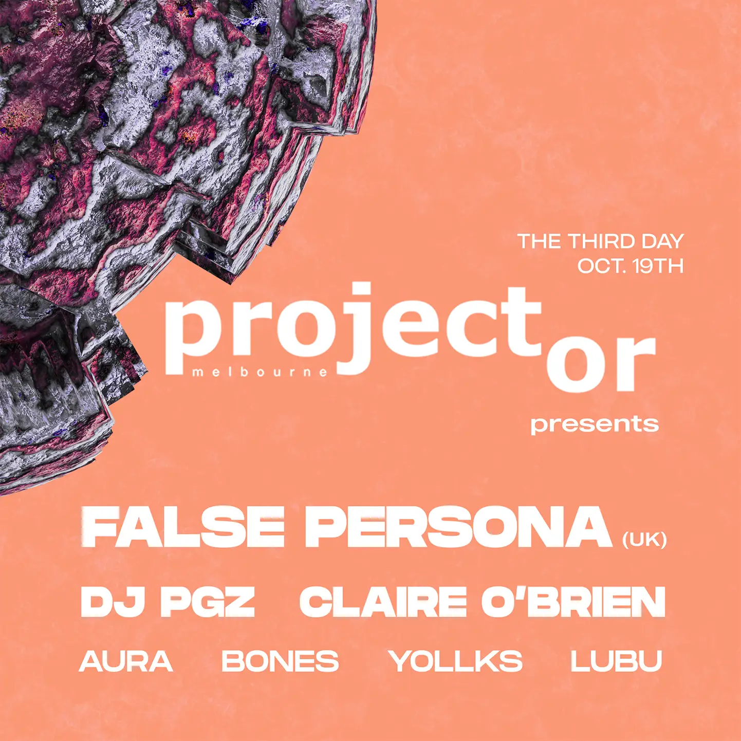 Projector Melbourne presents FALSE PERSONA. This is going to be a high energy event filled with world class DJ's. It's all going to be taking place at the iconic Third Day in North Melbourne where the goodtimes will be had. It will all take place on Saturday 19/10/24 kicking off at 6 through to 1am. Let's dance!