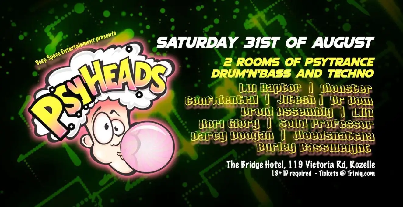 Hat trick Chloe Jade Riley Chandler Cem Oztunc Lauren Brereton Jamie Leigh Psyheads Room DJ Confidential Monster Raptor Explore Jitesh Droid Assembly Dr Dom Tech and Bass Room Solid Professor LIIA Darcy Doogan Burley Bassweight DJs Weedsnatcha Hori Glory