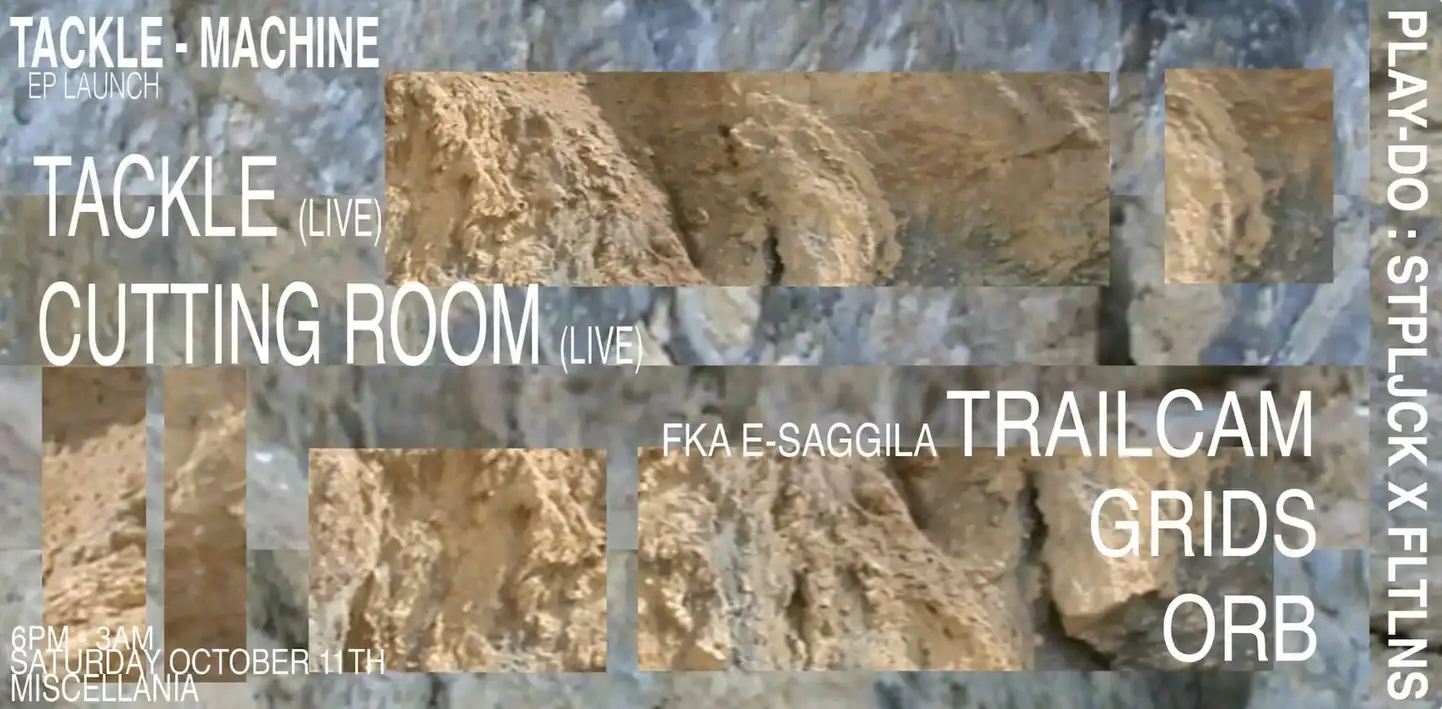 Tackle - Machine EP Release Party – *The following text has been gated Machine learning to dance? Teach your machine to dance with these three songs. You can dance with your machine when the work is done. A dancing machine is a happy machine. – Tackle (live) Another dark age, again! Weight shaped into strange momentum, steele under tension, menace and release. Fraying pressure for cracked ceilings and heavy systems. – Trailcam (fka E-Saggila) Operating out of Toronto, Trailcam crafts dense and feral music shaped by fractured percussion and dub's dislocation. Her approach to sound evokes a world that's constantly shifting with its clean edges eroded by repetition and drift. Released on Northern Electronics, her debut album Drumlin Loop serves as a weathered map of these sonic territories. – Cutting Room (live) - Grids - Orb – Play-Do : (y)our current responsive form. – 6pm - 3am Saturday, October 11th Miscellania – Detailed accessibility information : http://tinyurl.com/yc7kd7sb Steeplejack operates on the lands of the Wurundjeri Woi Wurrung peoples of the Kulin Nation, whose culture and customs have nurtured and continue to nurture this land. We pay our respects to elders past and present. To this day, colonial violence continues to shape the oppression of First Nations people in so-called ‘Australia’. Sovereignty has never been ceded.
