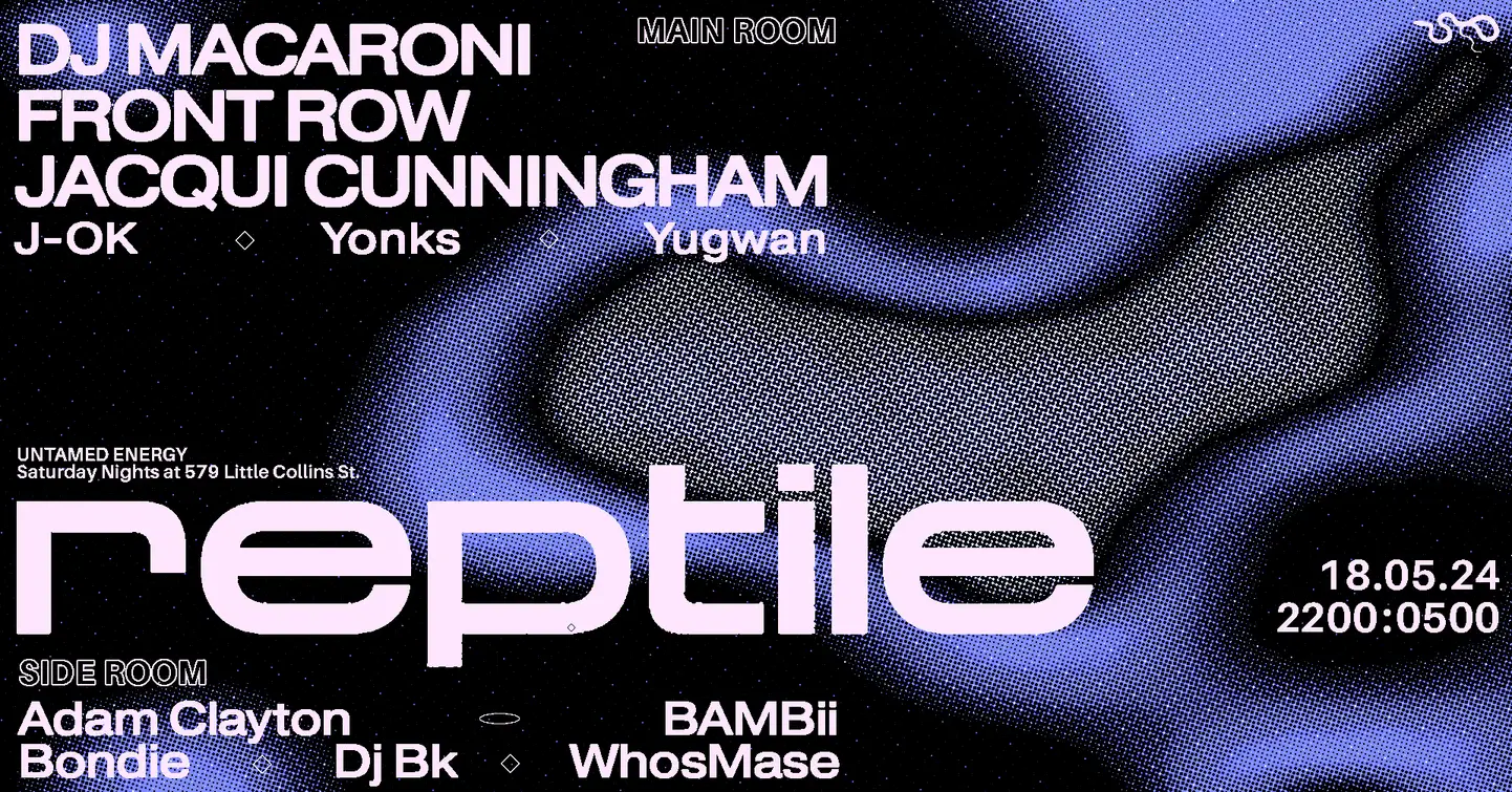 Reptile 32 - DJ Macaroni, Jacqui Cunningham -------------------------- Untamed energy every Saturday night. The Bottom End.