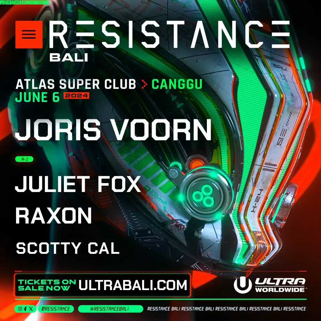 Get ready for an unforgettable night of electronic music at Resistance Bali, happening at Atlas Super Club Bali on June 6th, 2024. We're bringing you a stellar lineup featuring some of the biggest names in the industry, including Joris Voorn, Juliet Fox, Raxon, and Scotty Cal. Prepare to be swept away by their captivating beats and dynamic performances as they take you on a journey through the realms of techno and house music. Secure your spot now with general admission tickets priced at 750k. Don't miss your chance to be a part of this incredible event. See you on the dance floor!