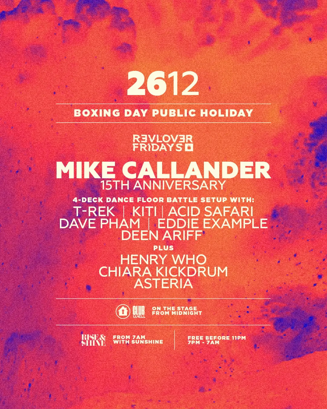 Mike Callander 15th Anniversary — Revolver Fridays Friday 26th December (Boxing Day Public Holiday), 09:00PM - 07:00AM, Revolver Upstairs ————————————————————— On 26th December we’re celebrating 15 years of Mike Callander playing Fridays at Revs. When we first invited Mike to take over as Friday resident in 2010, the other international news of the year was the volcanic eruptions at Eyjafjallajökull, Iceland. Closer to home, Julia Gillard had just taken over from K-Rudd—a lot has happened since! After 780 weeks of programming and more than 2300 hours behind the decks, Mike has assembled a lineup to celebrate some of his favourite Revs collaborators and some of his biggest inspirations since his career kicked off in 2001. The highlight is a 4-hour, 4-deck battle formation in the middle of the Revs dance floor with T-Rek, Kiti, Acid Safari, Dave Pham, Eddie Example, and Deen Ariff. Before and after that we’ll hear from Henry Who, Chiara Kickdrum, and Asteria. Cancel your Saturday plans and please join us for a dance! ————————————————————— LINE-UP: MIKE CALLANDER (15TH ANNIVERSARY) T-Rek Kiti Acid Safari Dave Pham Eddie Example Deen Ariff Henry Who Chiara Kickdrum Asteria Plus Refuge x Club Well from midnight on the stage, and Rise & Shine w/ Sunshine from 7am Saturday morning. ————————————————————— Revolver Upstairs respectfully acknowledges the Boon Wurrung People of the Kulin Nation, their elders, past and present, who are the Traditional custodians of he land never ceded. We also acknowledge the Traditional Owners of lands and waters across Australia, their elders, ancestors, and recognise their continuing connection to, and aspirations for Country. Revolver Upstairs prides itself on being an inclusive space. Please visit our website for more info.