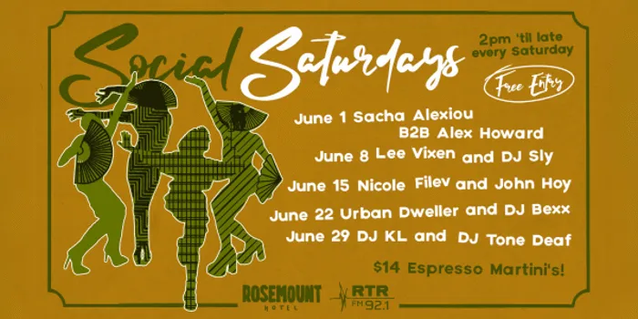 Rosemount Hotel & RTRFM present Social Saturdays in Rosie's Backyard every Saturday from 2pm. Gather your group and head to Perth’s best backyard for an afternoon of community connection through shared experience at SOCIAL – our Saturday arvo sundowner. 4PM 'TIL LATE EVERY SATURDAY FREE ENTRY $14 ESPRESSO MARTINI'S FROM 2PM! JUNE 1st - Sacha Alexiou B2B Alex Howard 8th - Lee Vixen & DJ Sly 15th - Nicole Filev & John Hoy 22nd - Urban Dweller & DJ Bexx 29th - DJ KL and DJ Tone Deaf