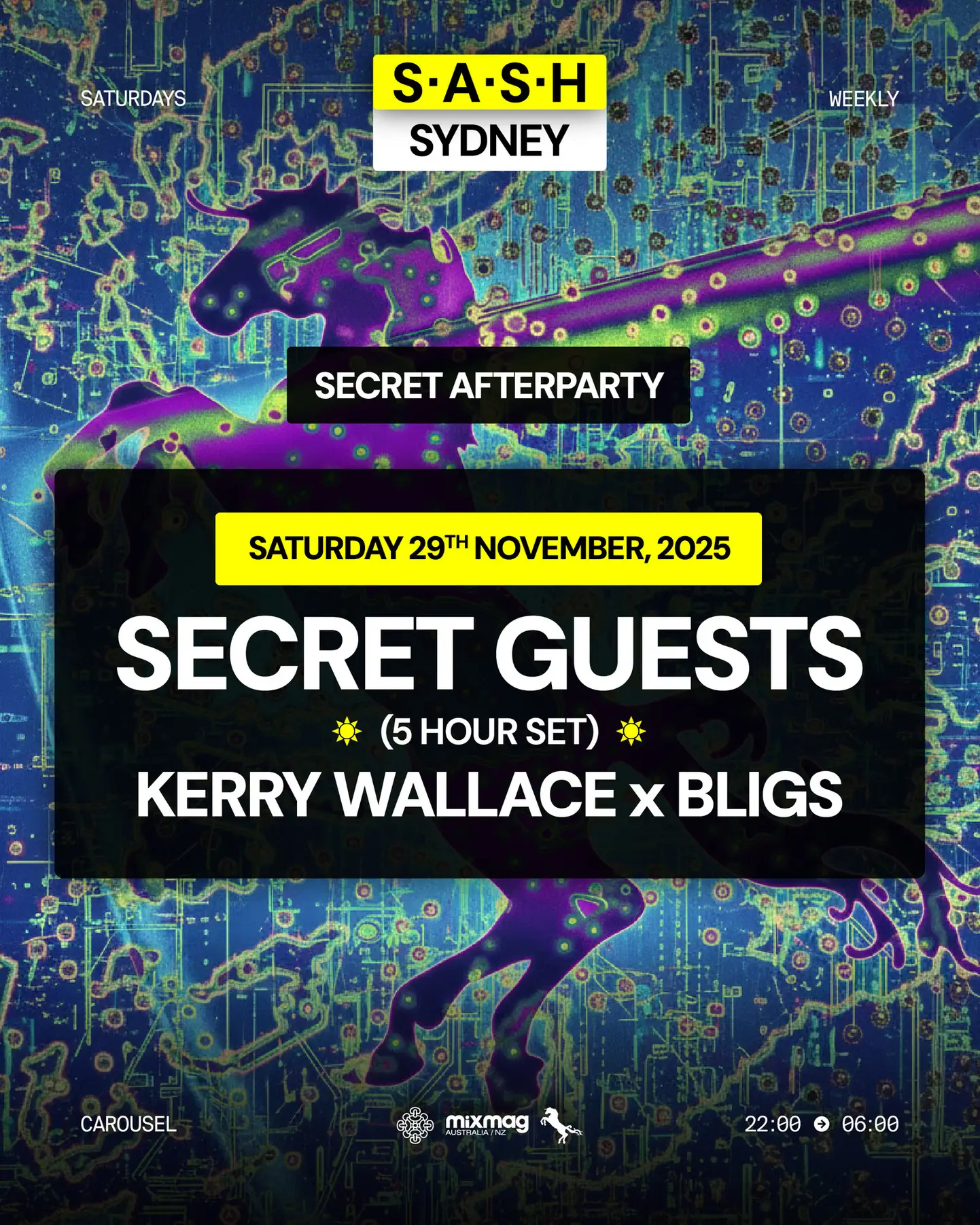 ★ S.A.S.H Sydney ★ Secret After Party ★ Secret Guests (5-Hr Set) ★ Saturday 29th November ★ --------------------------------- You’ll have to trust us on this one, the S.A.S.H team knows a thing or two about utilising Secret Guests to their absolute best. I wouldn’t hesitate on this, it would be a serious shame to miss out! Kerry Wallace & Bligs are tying the knot, marrying up their deep sounds to warm the floor for an extended 3 hour set… before who though? As always, you bring your dancing shoes, we’ll provide the rest xx --------------------------------- S.A.S.H Sydney Saturday 29th November 10pm – 6am --------------------------------- Carousel Level 2, 169 Oxford Street, Darlinghurst, NSW, 2010