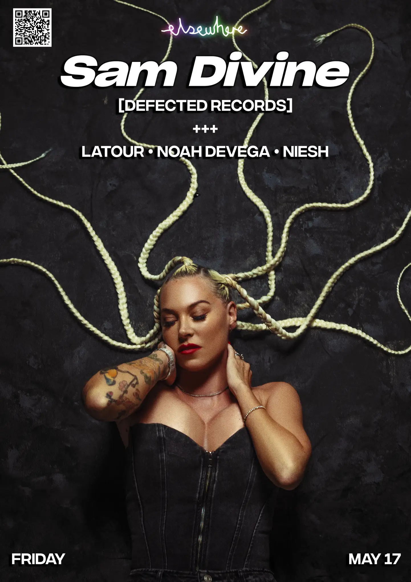 Welcoming back to elsewhere Defected Records queen "Sam Divine" A born entertainer with a burning desire to play music to people around the world, Sam Divine’s enigmatic sets are an effortless schooling in pure, unadulterated house. From her early days as the sole member of the Defected street team in Ibiza to fronting their radio show and now headlining some of the world’s biggest clubs and festivals, The First Lady of Defected, has become an intrinsic part of the UK house music scene. The seeds of Sam’s DJ career can be traced back to a pair of belt drive turntables and a battered Numark mixer set up in her Mum’s shed; a pirate radio show broadcast from her bedroom using ‘borrowed’ equipment from the local college and MSN Messenger, and time spent expanding her musical knowledge working at Spin Central in her hometown of Weston-super-Mare and Chemical Records in Bristol. A chance encounter with then Defected Radio host, Aaron Ross, in Notting Hill in the early 00s, led Sam to Ibiza where she quickly became an integral figure in the West End. Since then she’s played at some of the island’s biggest clubs year upon year, holding down residencies at Pacha, Mambo, Amnesia, Eden and Ushuaïa, and sharing space with some of the greatest names in dance including Frankie Knuckles, Master’s At Work, MK, DJ Spen, KiNK, Sandy Rivera and The Shapeshifters. Sam launched her own highly successful imprint, DVINE Sounds, in 2015. To date, the label has seen 58 releases, helping to propel talented up and coming artists into the spotlight. Her own foray into production began with a remix of the classic garage anthem ‘Flowers’ that proved a hit, reaching the top spots on Traxsource and Beatport. A remix of Amira’s 1997 garage hit, ‘My Desire’, followed in 2019. In 2020 DVINE will celebrate its fifth birthday with the label evolving as a brand with events, boat parties, a stage at We Are FSTVL and a return to ADE. Sam will also launch Round Our House, a series of parties that encapsulate an intimate, house party vibe. 2019 was a year of firsts for Sam with her debut appearance at London’s Printworks venue, where she returned on New Year’s Day alongside her Defected crew. In September she was invited by Radio 1 tastemaker Pete Tong to record a coveted Essential Mix – a true marker of how far her career has come. 2019 also marked Divine’s first Mixmag Lab NYC set. All this on top of touring globally, playing 21 festivals worldwide, an epic gig at the top of London’s iconic Tower Bridge and raising over £40,000 for Breast Cancer Research through her charity D-Vita. Sam shows no sign of slowing down in 2020 with a number of Defected parties already in the diary, a return to the festival circuit, an Australasian tour and solo tours throughout North America and Canada. December will also see the return of last year’s sold-out Openers tour with Sam playing all night long across two weekends in December. 2020 brings new music in collaboration with Australian DJ and producer, Kormak, on Defected as well as a new EP on her own label. With her passion and dedication to her music beyond doubt, Sam Divine is a musician who will continue to evolve and grow. support from Latour • Noah Devega • Niesh