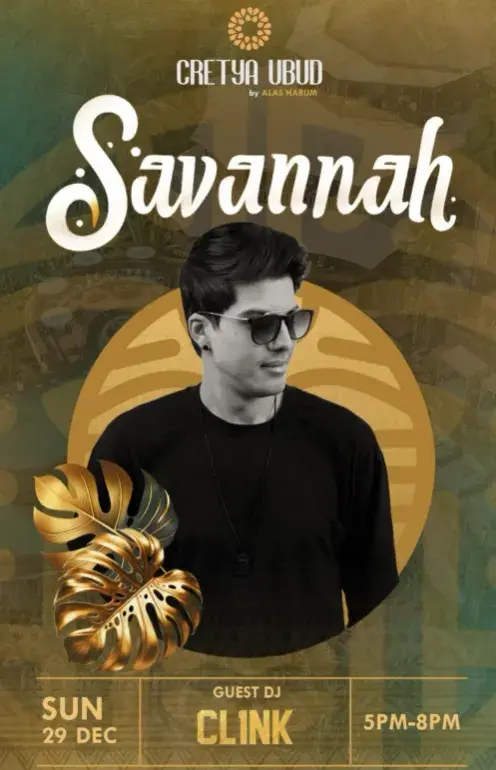 Experience an unforgettable evening filled with fun, delicious cuisine, and vibrant festivities inspired by the breathtaking beauty and untamed spirit of the Savannah. Let the jungle vibes take over with themed music and entertainment by @cl1nk and @subliminalbali. Savor a feast crafted with bold, exotic flavors, fit for the king of the jungle. Join us at Cretya Ubud for a night of adventure, excitement, and unforgettable memories. Seating is limited, so secure your spot now! - DJ set by @subliminalbali: 1 PM - 5 PM - DJ set by @cl1nk: 5 PM - 8 PM