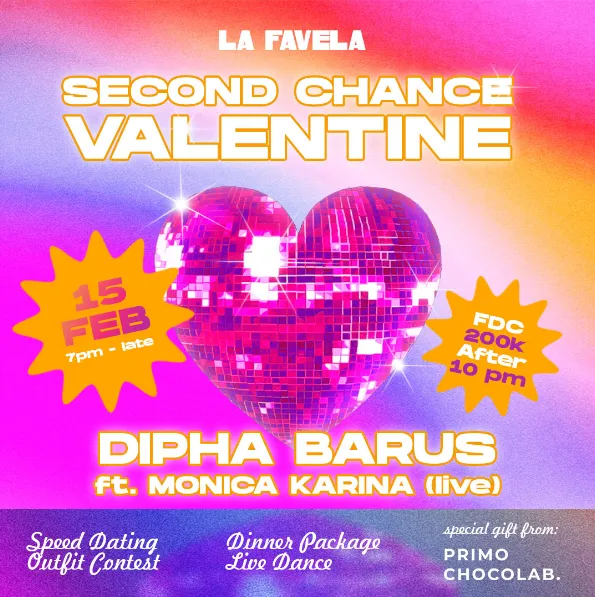 La Favela’s Second Chance Valentine On February 15th, love takes center stage as we transform the dance floor into a haven of romance. Indulge in a delightful romantic dinner starting from 7pm, or seize the opportunity to meet your perfect match (for free) during our speed dating event from 8 to 10pm. If flying solo, enjoy complimentary flow cocktails and dance the night away as we welcome the beats of DJ Dipha Barus & Monica Karina! Make sure to dress to impress in your finest Valentine's Day attire for a chance to win a special prize