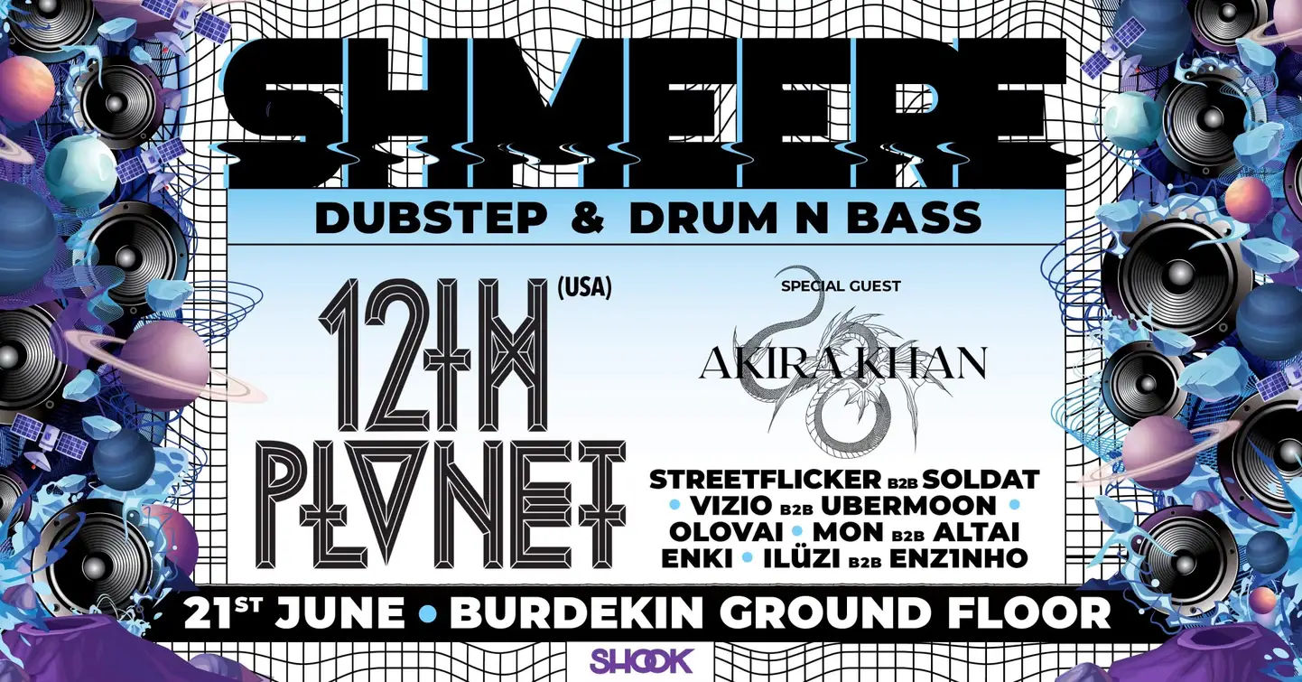 Do you love DUBSTEP? Do you love DRUM & BASS? WE LOVE BOTH! SHOOK Crew is excited to announce SHMEERE 13 featuring legendary international dubstep superstar 12th PLANET on Friday 21st June at the Burdekin Ground Floor (with the incredible Void sound system) on Oxford street (5min walk from Museum train station). There is no doubt that 12th PLANET is an absolute OG in the world of dubstep. He has produced countless bangers and collaborated with most of the big names in bass music. He has released music on bass music's most notable labels including Disciple, Never Say Die and OWSLA just to name a few. 12th PLANET has performed at every huge bass festival around the world and we are so lucky to have him perform in Sydney for one special night only. Alongside 12th PLANET we have Brisbane trap/bass producer AKIRA KHAN. You definitely don't want to miss this artists quick mixing and high-energy performance. . GOOD VIBES. SOLID SOUND. FILTHY BASSLINES. Supporting our headliners we have a mashup of heavy bass from; OLOVAI (dnb/dubstep) VIZIO (dnb/dubstep) UBERMOON (dnb/dubstep) SOLDAT (dnb) STREETFLICKER (dnb) ENKI (dnb/dubstep) ALTAI (dubstep/trap) MON (dubstep/bass) ILUZI (dnb) ENZ1NHO (dnb) Minimal tickets will be available on the door if not sold out prior. OUR EVENTS OFTEN SELL OUT so jump on tickets quickly. We support inclusion at our events and welcome everyone. If you are in a special circumstance and cannot afford a ticket, please contact us directly to arrange something- we believe good live music should be available to everyone. Our collective hold a permanent NO DICKHEADS policy always. We wish to acknowledge the traditional custodians of the land on which we gather, the Gadigal people of the Eora Nation and pay respects to their Elders past, present, and emerging.