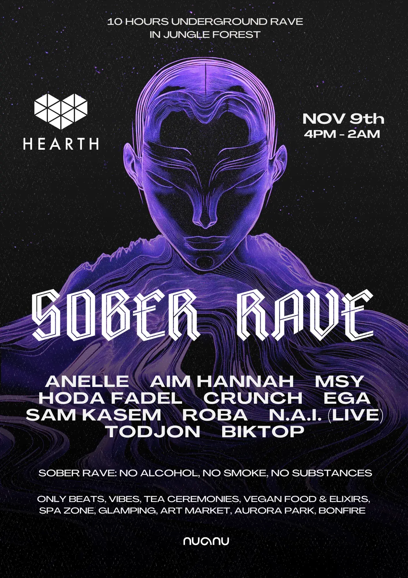 SOBER RAVE at HEARTH of Nuanu – A Wild New Kind of Rave -Time: 4 PM – 2 AM Get ready for a 10-hour underground rave where the only high is the music and genuine connection. This is a substance-free event—no alcohol, no cigarettes, no drugs—just pure energy and sound waves. (A designated smoking area will be available for those who need it.) Let loose to a diverse lineup of genres: breaks, techno, jungle, EBM, electro, bass, DnB, leftfield, psy tech, and trance breaks. -Featuring 11 Unique DJs: AIM HANNAH | ANELLE | BIKTOP | CRUNCH | EGA | HODA FADEL | MSY | N.A.I. (Live) | ROBA | SAM KASEM | TODJON Step into the heart of the jungle, where rave culture meets nature at the HEARTH. This open-air venue offers a custom-made sound system to keep the beats raw and immersive. What Makes the HEARTH Experience Special: -Tea House offering tea ceremonies -Vegan Food & Elixirs to nourish and recharge -Art Market featuring local creatives -Spa Zone for relaxation -Glamping Options for overnight stays -Aurora Park to explore -Cozy Bonfire under a starry sky This is more than a rave—it's a full sensory experience in the wilderness, reconnecting with the roots of rave culture. SOBER RAVE: Pure sound, pure energy, pure connection. Join us in the HEARTH of the Nuanu jungle for a night of unforgettable beats and vibes!