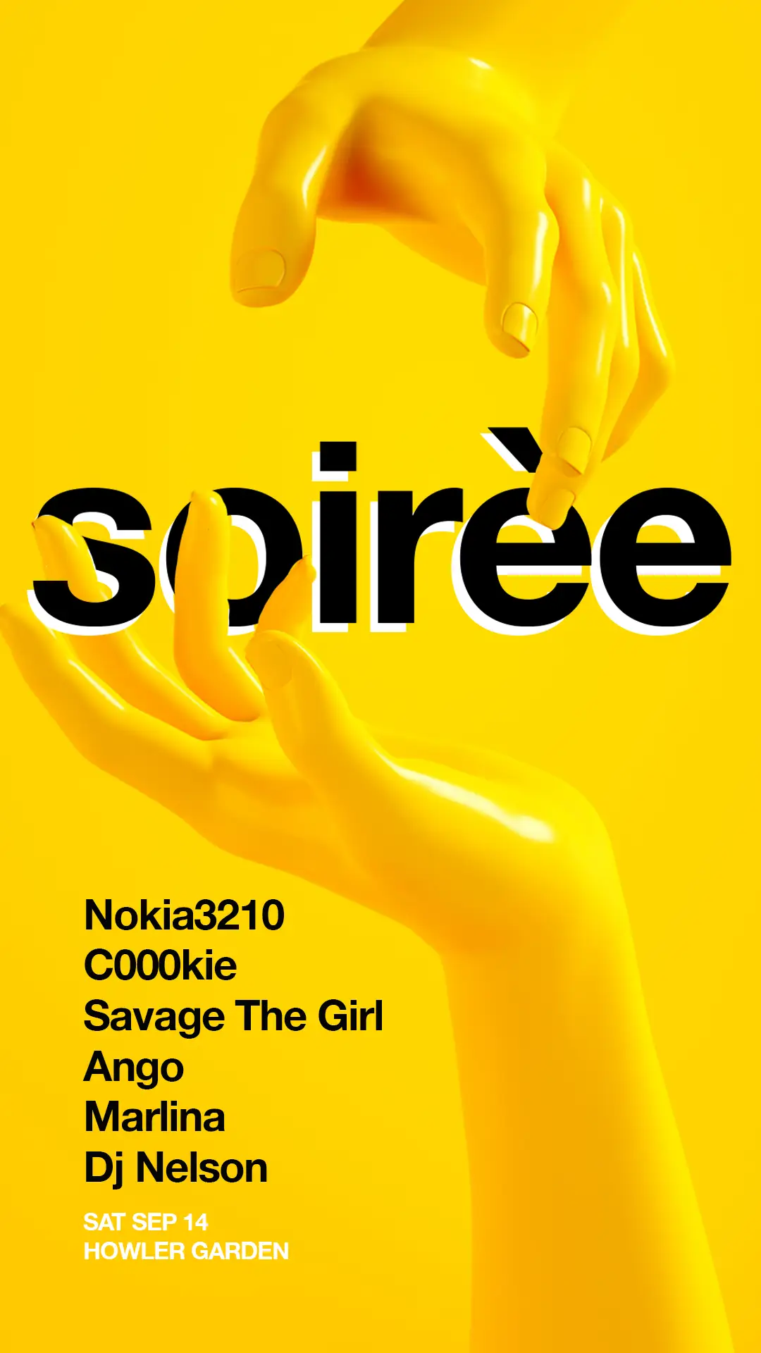 Soirée is returning for its second edition with another free party. Once again, our lineup is fuelled by all things dance music; garage, bass, house, afro, and everything in between. Alongside our residents; Marlina, Savage The Girl and Ango, we've got some strong talent making their debut. Firstly, C000kie. A name ringing throughout the city as of late, she boasts an impressive mix of bass, garage and afro, evidently making her a prime pick for Soirée. Secondly, we've got Nokia3210 - a side project from one of your favorite garage DJs - you'll have to come find out what she is all about. Finally, we present DJ Nelson! A resident of Howler with a keen ear for 90s dance tracks, there is no doubt he will be able to heat up Soirée's second edition. See you at the Soirée.