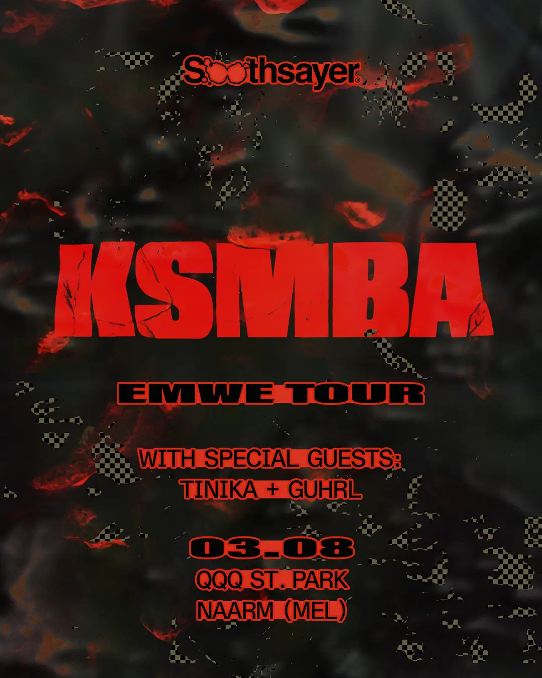 Soothsayer presents: KSMBA - Emwe Tour Known for their signature hypnotic grooves and percussive perfectionism which has ensnared crowds across the country and following the release of their debut EP ‘Emwe’ this July, Naarm’s very own rising star KSMBA is set to bring 3 hours of raw, undeniable energy to their debut headline show at QQQ. ST Park on Saturday 3rd of August. KSMBA’s sets are constructed with precision and grit, unifying dancefloors with an undeniable inertia. Their sound has seen them become one of the most in demand DJ’s in the country in the past 18 months, supporting Mall Grab, Samba Boys, Effy, LSDXOXO and STÜM and making sonic sanctuaries of renowned venues and festivals from Sub Club to PICA, Teletech to Pitch Music and Arts. KSMBA’s unique sound is on full display in their highly anticipated forthcoming debut EP “Emwe” out soon on STÜM’s Happy Wax Records. Emwe, meaning “one” in Runyankole dialect, weaves together an array of influences ranging from their Urgandan heritage to Techno’s roots Black culture. Transitioning from classical music to the techno scene KSMBA brings a mature sound, seamlessly blending sharp drum patterns and deep basslines across the EP to provide an initial distillation of their sonic landscape. We are proud to host some outstanding talent alongside KSMBA, with support from Naarm’s widely renowned UK Funky and Hard Drum savant Tinika and rising percussive techno selector Guhrl. Tickets on sale Thursday 11th July and are highly limited for what will be an unforgettable night.