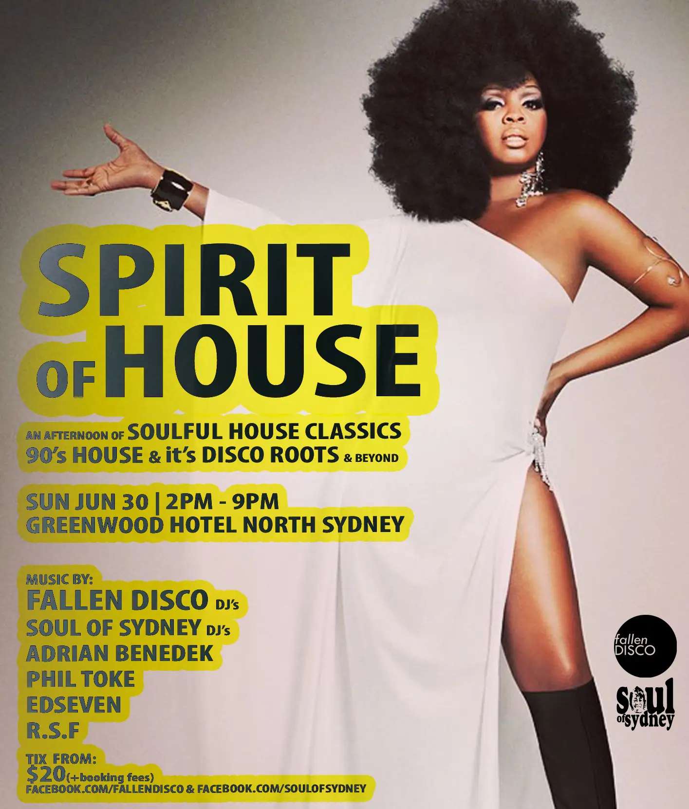 SOUL OF SYDNEY & FALLEN DISCO crew presents SPIRIT OF HOUSE A tribute to SOULFUL HOUSE, 90's House era & its DISCO roots. A Sunday afternoon tribute to 90's HOUSE, SOULFUL HOUSE CLASSIC + its DISCO ROOTS. Hosted by: FALLEN DISCO & SOUL OF SYDNEY DJ’s; PHIL TOKE, ADRIAN BENEDEK EDSEVEN RSF. + more Tix from $20.00 dropping this week. Happening at Greenwood Hotel North Sydney.