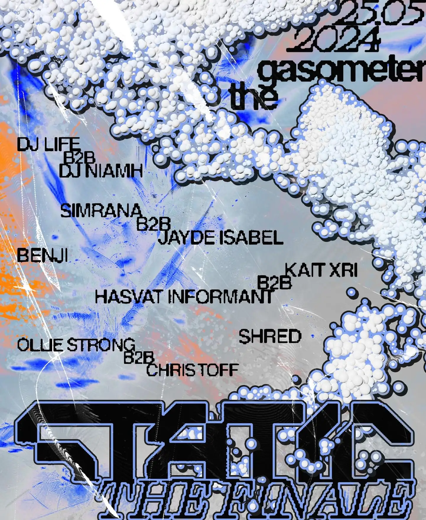 5 years, 25 events and over 80 different artists booked, it’s been a serious ride and we thank everyone who has been apart of our Static family. For the DJs, collaborators and all our punters; this one’s for you. Let’s send it off in the biggest way possible for our last event, ever! Soundtracked by Static’s own and some dear friends (A-Z): Benji DJ Life B2B DJ Niamh Hasvat Informant B2B Kait Xri Jayde Isabel B2B Simrana Ollie Strong B2B Chris Toff Shred Static acknowledges the traditional owners of the land, the Wurundjeri people of the Kulin Nation. We pay our respects to elders past, present and emerging. Free entry for all Aboriginal and Torres Strait Islander patrons. Get in touch with us prior to the event by messaging the Static instagram if possible. There is a strict zero tolerance policy towards racism, homophobia, transphobia, sexism, ableism or violence of any kind. Please report any unwelcome behaviour to staff or event organisers. Artwork by @lny__________graphics