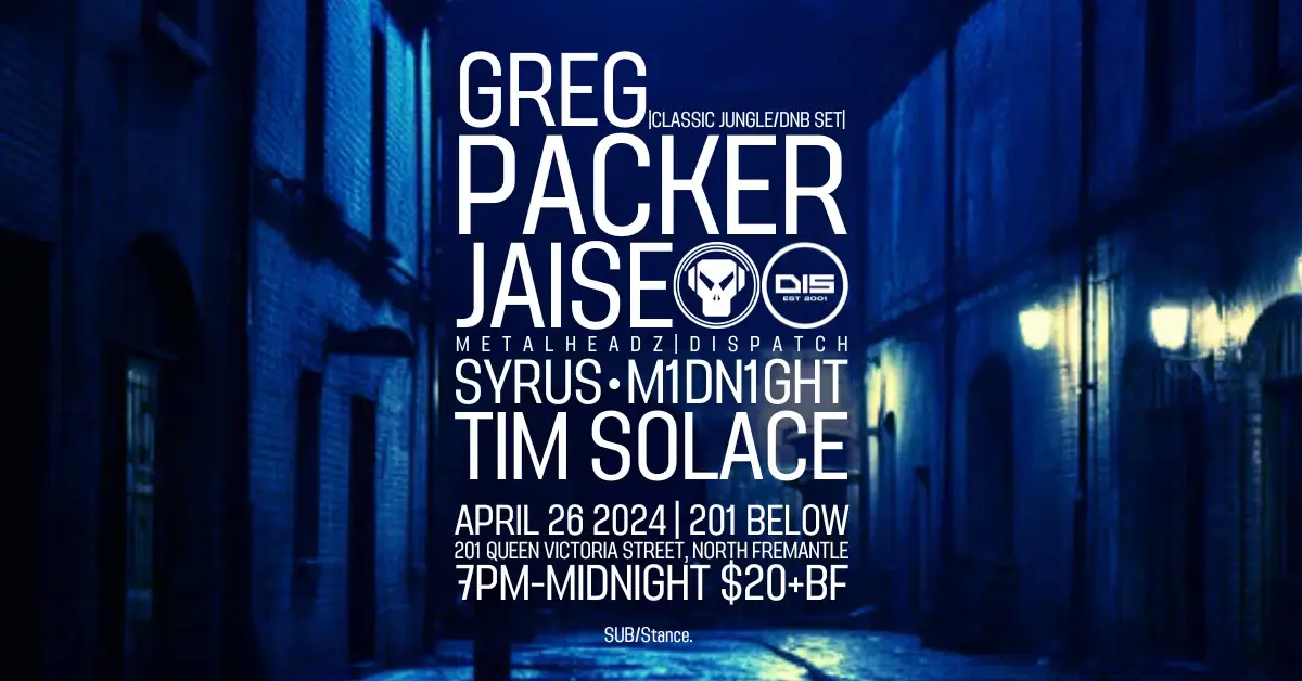 Sub/stance. proudly presents this special event featuring Perth's original Jungle/Drum & Bass ambassador, Greg Packer. Instrumental and well known for establishing and fostering the growth of the culture in Perth from 1994, Greg Packer is responsible for what has become a world renowned, thriving scene, now spanning 30 years. As a DJ & Producer, Greg has acheived it all, with his ever-increasing success on the DJ circuit and releasing music on countless labels including LTJ Bukem's Good Looking Records, Defunked, Hardleaders, Tangent, Phuturo, Fokuz, Gain & his own label Interphase which he established in 2000. If you consider yourself a fan of Jungle/Drum & Bass, then join us on April 26th in celebration of Greg Packers' monumental legacy and contribution to Western Australian dance culture and the music we've all come to love and live by. Joining in suppport will be SUB/stance. regulars Jaise, celebrating the release of his latest EP, Rail Yard Blues on Armory and packing a stock pile of the freshest dubs and promos from Metalheadz, Dispatch and other label affiliates along with Syrus, Tim Solace & M1dn1ght for his second run on the SUB/stance stage. It is our objective to build a collective and creative environment for artists, DJ’s, cultural enthusiasts and those with a keen interest in the freshest Jungle/Drum & Bass to meet, dance, network, collaborate on future projects and build a culture that is passionate about hearing brand new, forthcoming underground music on a system designed and engineered for Jungle/Drum & Bass.