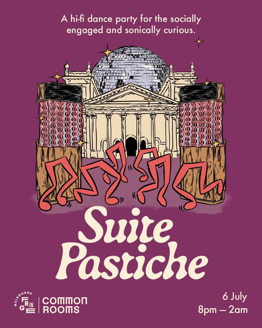 We’re getting back together for Suite Pastiche: a hi-fi dance party for the socially engaged and sonically curious. We'll be moving your body and mind through a vinyl-only voyage of jazz, reggae, Latin, Afro, disco, electronic, and niches in between – all played through a stunning four-point Klipsch soundsystem in a beautiful ballroom. Energy is essential for any good party, so there’ll be a grazing table for early arrivals, a bar, and a chill-out lounge. A few things to help make the evening as special as possible: ✧ We want Suite Pastiche to feel like one big house party, with an atmosphere where folks feel welcome, safe, and relaxed together. Please treat the venue as you would your own home, and other people as you would your own guests. ✧ These parties are best experienced as collective journeys from beginning to end, so arrive early and stay late if you can. The trip will be worth it. ✧ We like the dance floor to be a space to connect with music, your body, and the people around you, so please refrain from using your phone while you’re on it. See you on the dance floor!