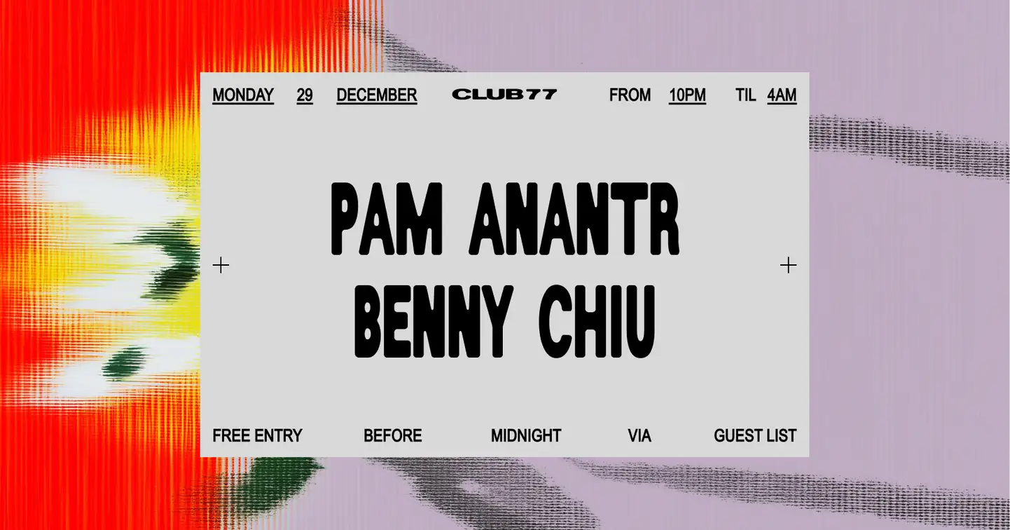 Club 77: Pam Anantr, Benny Chiu - ✦ Monday 29th December ✦ Pam Anantr, Benny Chiu ✦ 10:00pm - 4:00am ✦ Free entry on guest list before 12am ✦ $15.00 After - This event takes place on stolen land. Free entry for all First Nations people and is also offered for those who require it. DM or email contact@club77.com.au for access. Club 77 is an ally to the LGBTQI+ community and a safe space for freedom and expression. We have zero tolerance for transphobia, homophobia and racism. - Dance | Explore | Connect | Manifest Celebrating 28 years as a hub for local club culture and a safe space for freedom and expression.