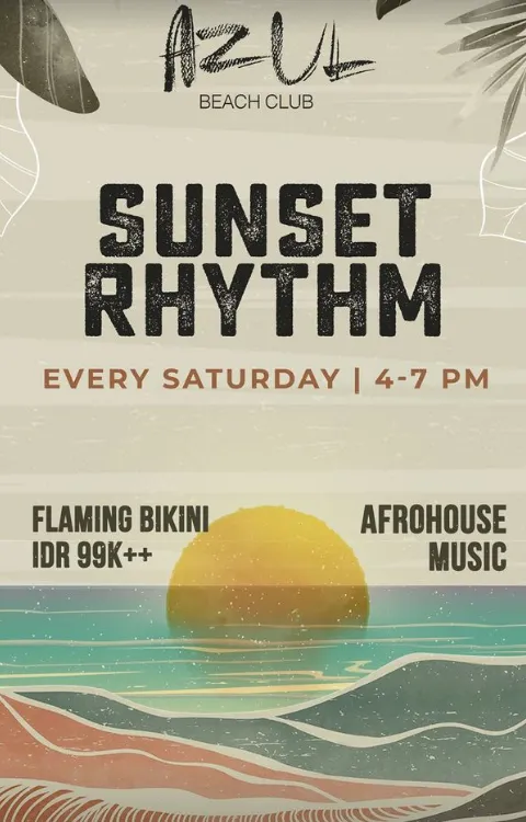 Get ready to groove at Azul Beach Club with "Sunset Rhythm" every Saturday from 4 PM to 7 PM. Immerse yourself in the vibrant atmosphere and dance to the beats of Afrohouse music spun by our talented DJs. Indulge in our special offer of a flaming bikini for just IDR 99k++ while you enjoy the sunset vibes.
