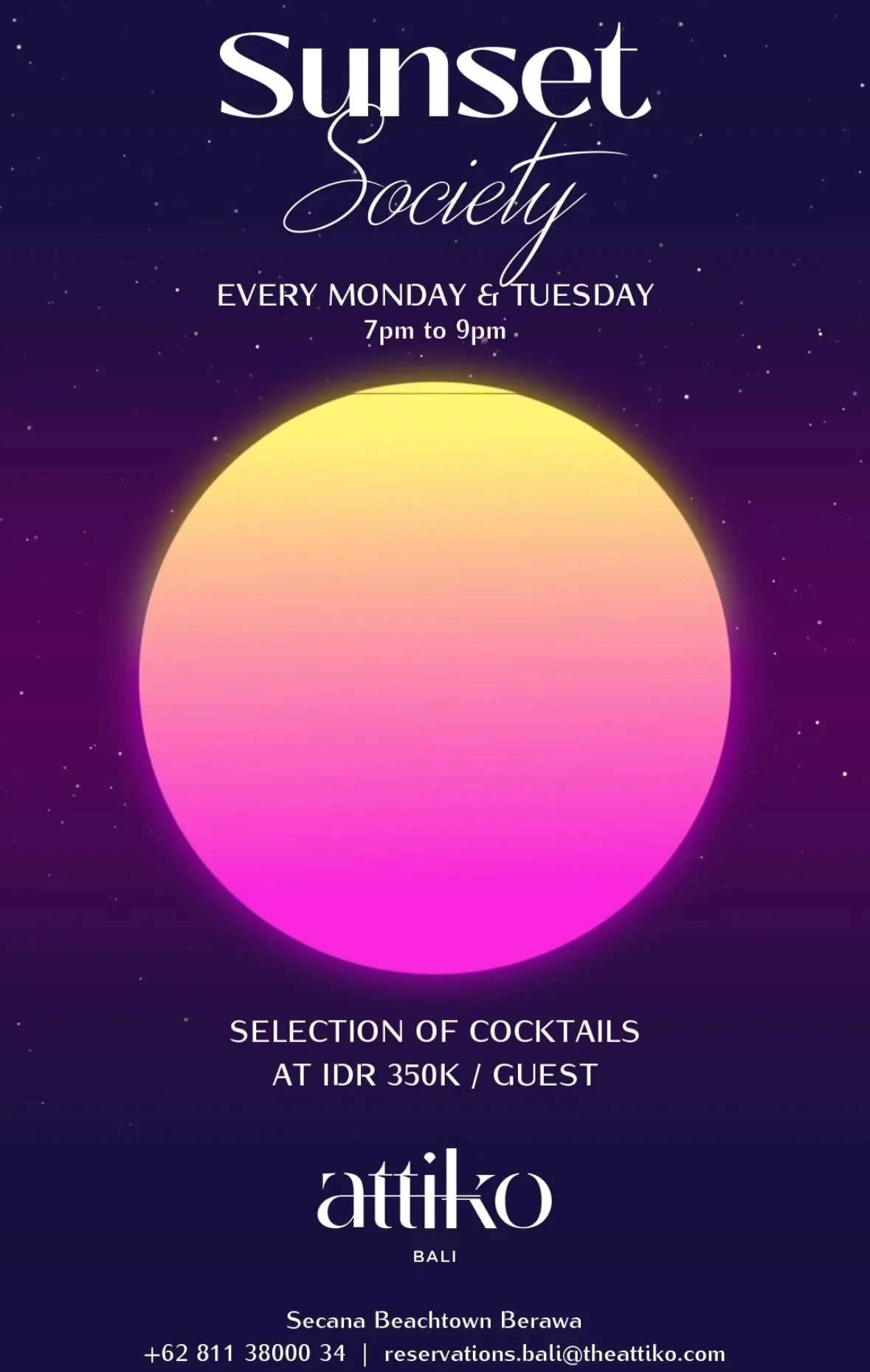 Experience the Sunset Society at Attiko Bali, a delightful event held every Monday and Tuesday from 7 PM to 9 PM. During these enchanting evenings, guests can enjoy a curated selection of cocktails for IDR 350,000 per person. Join in for a perfect blend of vibrant flavors and stunning sunset views, creating an unforgettable atmosphere to unwind and socialize.