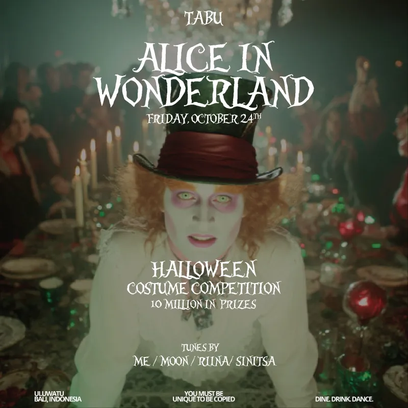 October 24 / Saturday ALICE IN WONDERLAND HALLOWEEN PARTY Tunes by: Top 10 DJs in Bali FOLLOW US DOWN THE RABBIT HOLE Come vibe with us as we kick off a new chapter with unforgettable parties, fresh vibes, and stunning upgrades. Get ready to dine, drink, dance and make memories. Don't miss out! The nights you’ve been waiting for is finally here. 🔥💃🕺 TABU SUPPER CLUB.