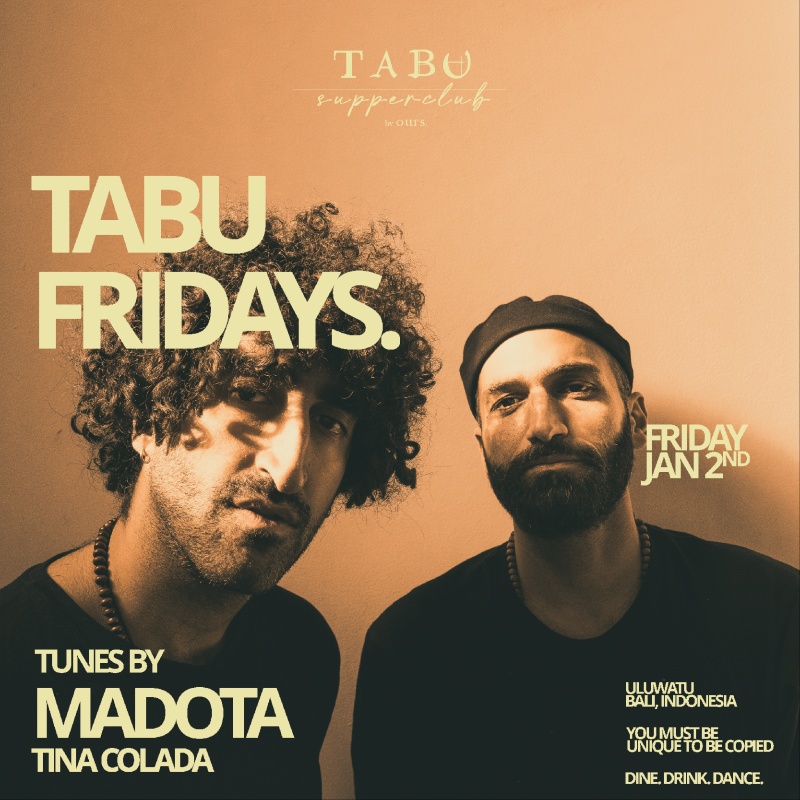 MADOTA DJ LIVE AT TABU Date: 02 January 2026 | Time: From 9pm Venue: TABU – Uluwatu Madota DJ takes over TABU for a high-energy night of deep grooves and dancefloor-driven beats, set inside iconic TABU’s Uluwatu. Expect premium cocktails, powerful sound, and late-night vibes. 🎟 Limited capacity – book early. Dress code: Smart casual | Age: 21+
