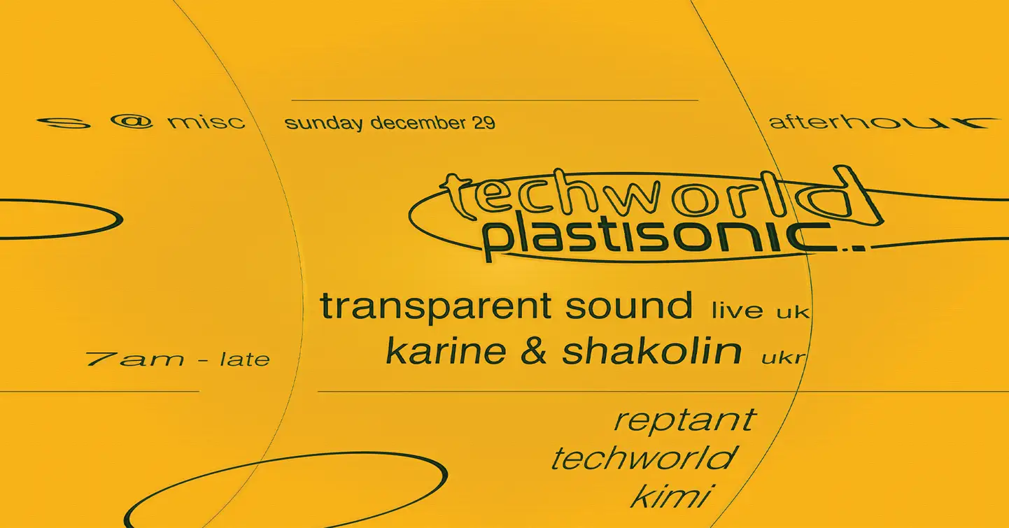 Techworld & Plastisonic join forces to bring an 18 hour morning into night club experience to close out the year. UK electro OG Transparent Sound grace's us with a hardware live set, as well as an extended session from beloved residents of Kyiv institution Closer, Shakolin & Karine. Reptant marks his return with a homecoming DJ set for the ages, while Techworld open things up on the roof in the morning with their signature afterhour vibe control. Resident Kimi rounds out the perfect lineup to ring in the new year ;)) Techworld and Plastisonic acknowledge that the land on which we operate is stolen. We pay our respects to the traditional custodians of the land, the Woi Wurrung and Boonwurrung peoples of the Kulin Nation in Bulleke-Bek. We pay our respect to their Elders past, present and future and extend that respect to all Aboriginal and Torres Strait Islander peoples today. Any First Nations people who wish to attend this event will not be charged.��