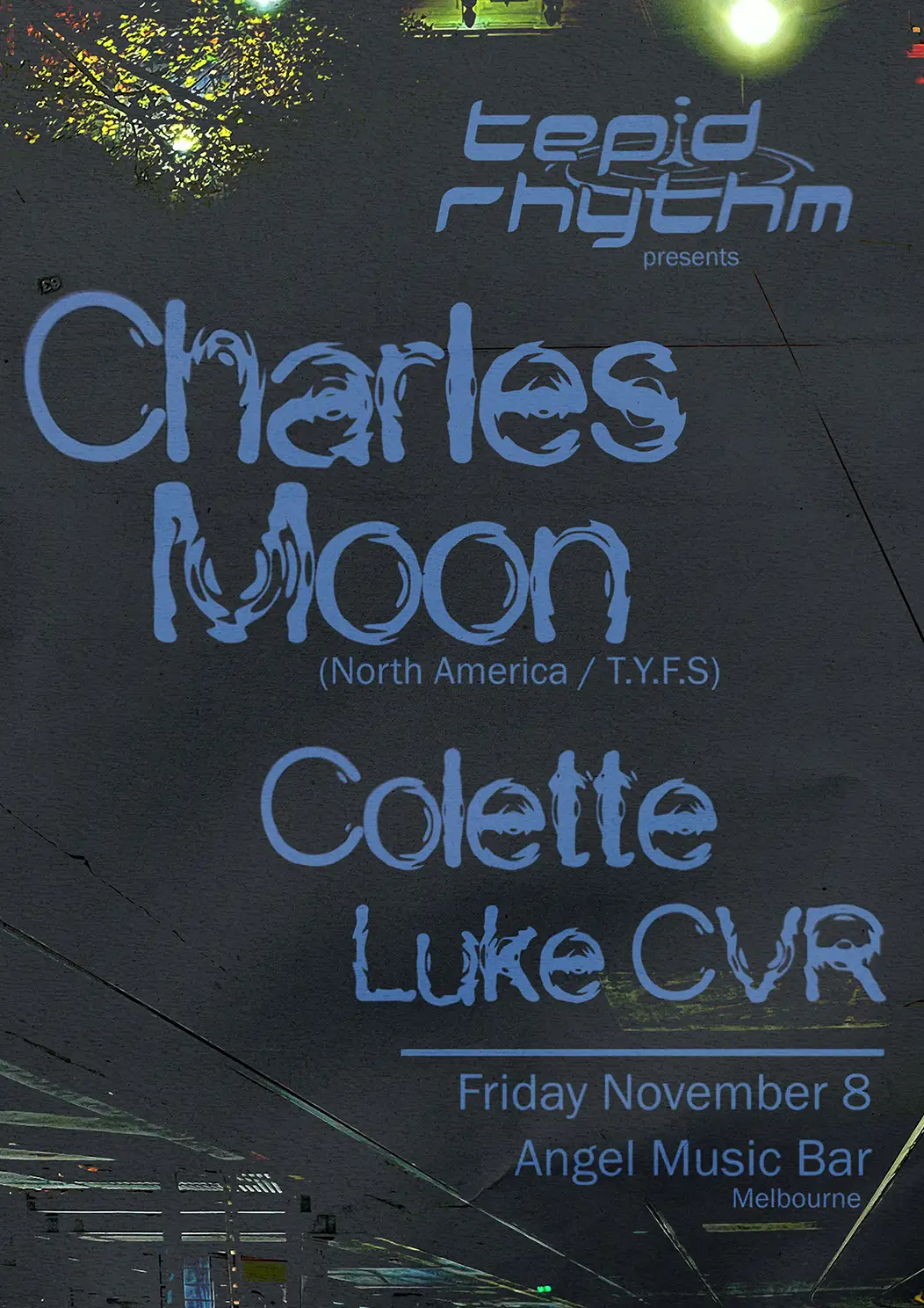 Tepid Rhythm is proud to return to you for another live journey of beautiful dance music. On Friday November 8th we will be taking over one of our most beloved spaces in Naarm, Angel Music Bar. With its intimate upstairs dance floor powered by a Funktion One Soundsystem, Angel Bar arguably hosts one of the best rooms for underground dance music in the city. We are also excited to present our very first international guest to Tepid Rhythm. Charles Moon is a multi-faceted DJ and curator. Hailing from Austin, TX, he now splits his time between LA and Mexico City. Charles is a global ambassador for his eclectic soundscapes and renowned selections behind the decks, having made numerous appearances in NYC’s iconic The Lot Radio. Charles also arrives to Australia after packed European summer which saw him perform at Panorama Bar and Melt Festival alongside Refuge Worldwide’s Richard Akingbehin. In addition to his sought after DJ sets, Charles has made a name for himself on the party circuit, founding the innovative ‘Thank You For Sweating’ (TYFS) imprint in Austin, TX. TYFS has hosted talented artists and selectors Dreamcastmoe, AceMo & Ron Like Hell. Charles is also a Grammy nominated producer/sound engineer, credited on Big Baby Dram which received a Gold record certification. Most recently, Charles produced pixelated/fighter pilot on Hamond’s ‘Pirate Radio’ album. With such a creative energy, we are excited to welcome Charles to Melbourne and look forward to hearing all of the music he brings with him. Supporting Charles Moon is an icon of the Melbourne dance community. DJ and Melbourne legend Colette has indeed devoted a lifetime of involvement in the local music community. With a passion for a get down, she first appeared at the impeccably curated Inner Varnika Festival in 2017 and has secured local support roles for touring artists such as Noname, The Internet, Mr Scruff, Throwing Shade & Eliza Rose. A couple of coveted interstitials later, a cruise in the infamous Bait Shop and a Boiler Room debut in 2023, Colette’s mantra of good times, vibe and dance are key; with bass heavy dance floor jams to smooth grooves, there’s always soul. A resident DJ of the Toff In Town’s ‘Now Here This, and with upcoming performances at major festivals Echo Beach and Let The Eat Cake, we couldn’t be more excited to have her involvement as she continues to inspire more and more dancers across the city each year. We can’t wait to pair these creative performers together and we think they will combine flawlessly at Angel Bar on November 8.