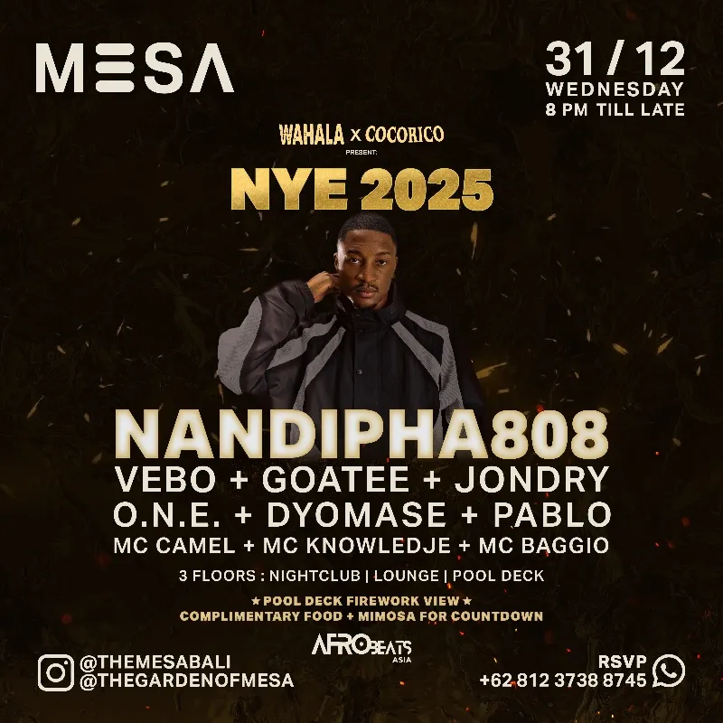 NYE 2025 at MESA Bali The Most Awaited Countdown in Bali! 🥂 WAHALA x COCORICO join forces to bring you an unforgettable New Year’s Eve across 3 floors – Nightclub, Lounge & Pool Deck with fireworks view, complimentary food & mimosa countdown celebration! Mesa Nightclub: WAHALA | AFROBEATS x AMAPIANO Headliner: NANDIPHA808 - South Africa 🇿🇦 DJ & Producer 🎧 Supported by Mesa residents: Vebo, Goatee & Jondry 🎤 Hosted by: MC Camel & MC Baggio Mesa Lounge: COCORICO experience all night long with the best French vibes! 🇫🇷 🎧 O.N.E., Dyomase & Pablo 🎤 Hosted by: MC Knowledje What to Expect: 💃 3 floors of non-stop music & entertainment ⏰ From 8pm until Sunrise 🎆 Exclusive Pool Deck Fireworks Viewing 🍸 Complimentary bites & Mimosas at midnight 🌍 International + Bali’s top DJs and MCs Don’t miss the NYE everyone will be talking about. Secure your ticket now and dance into 2025 in unforgettable style! 🎟️ Early Bird Tickets are LIMITED Secure your spot now before prices increase!