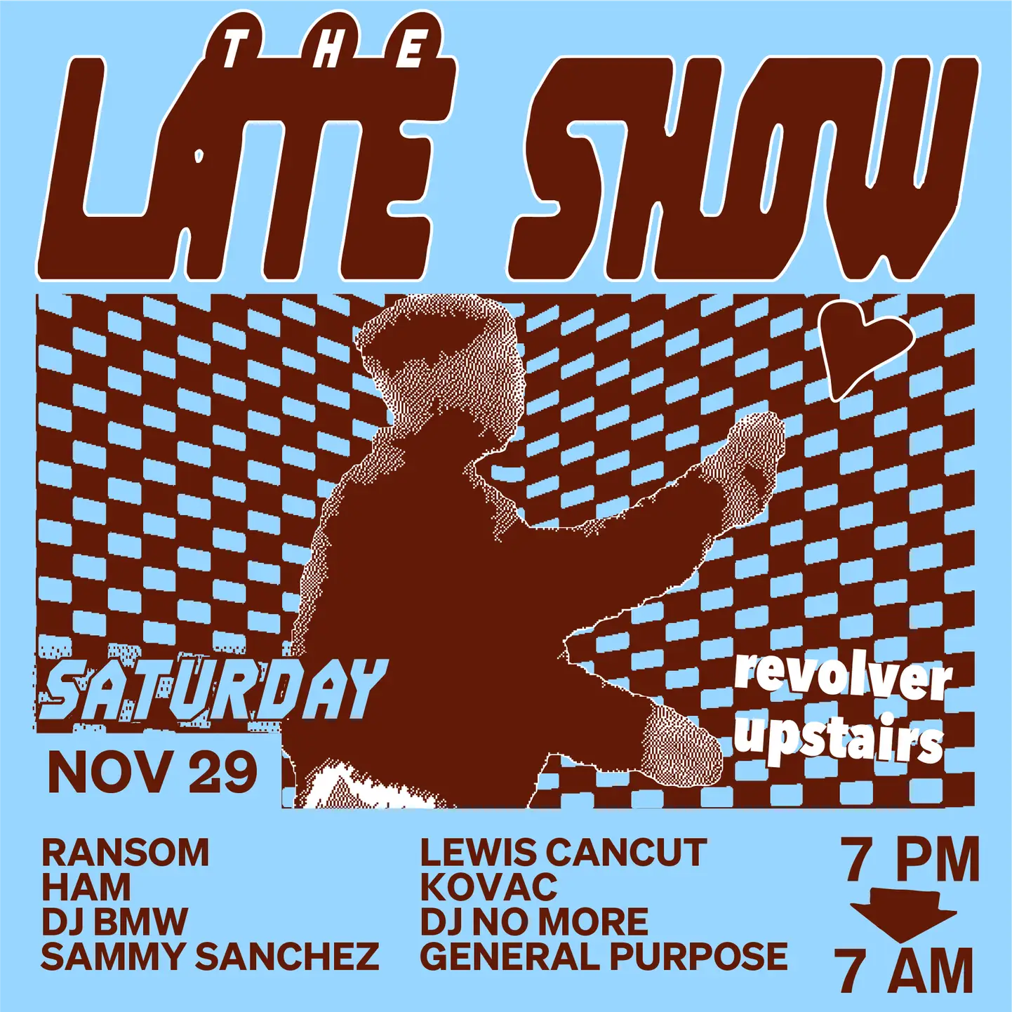 The Late Show is Revolver’s weekly Saturday night. Spread over two rooms, the night begins with Colonel Tan’s restaurant, then gathers pace around 10pm. In the front room, a barrage of Garage, Bassline, Techno and Qgom is shelled down; while in the back-bar, DJ’s splice together House with layers of Italo, Soca and Afro. Residents Ransom, Lewis CanCut and guests plus Boogs from 7am Sunday.