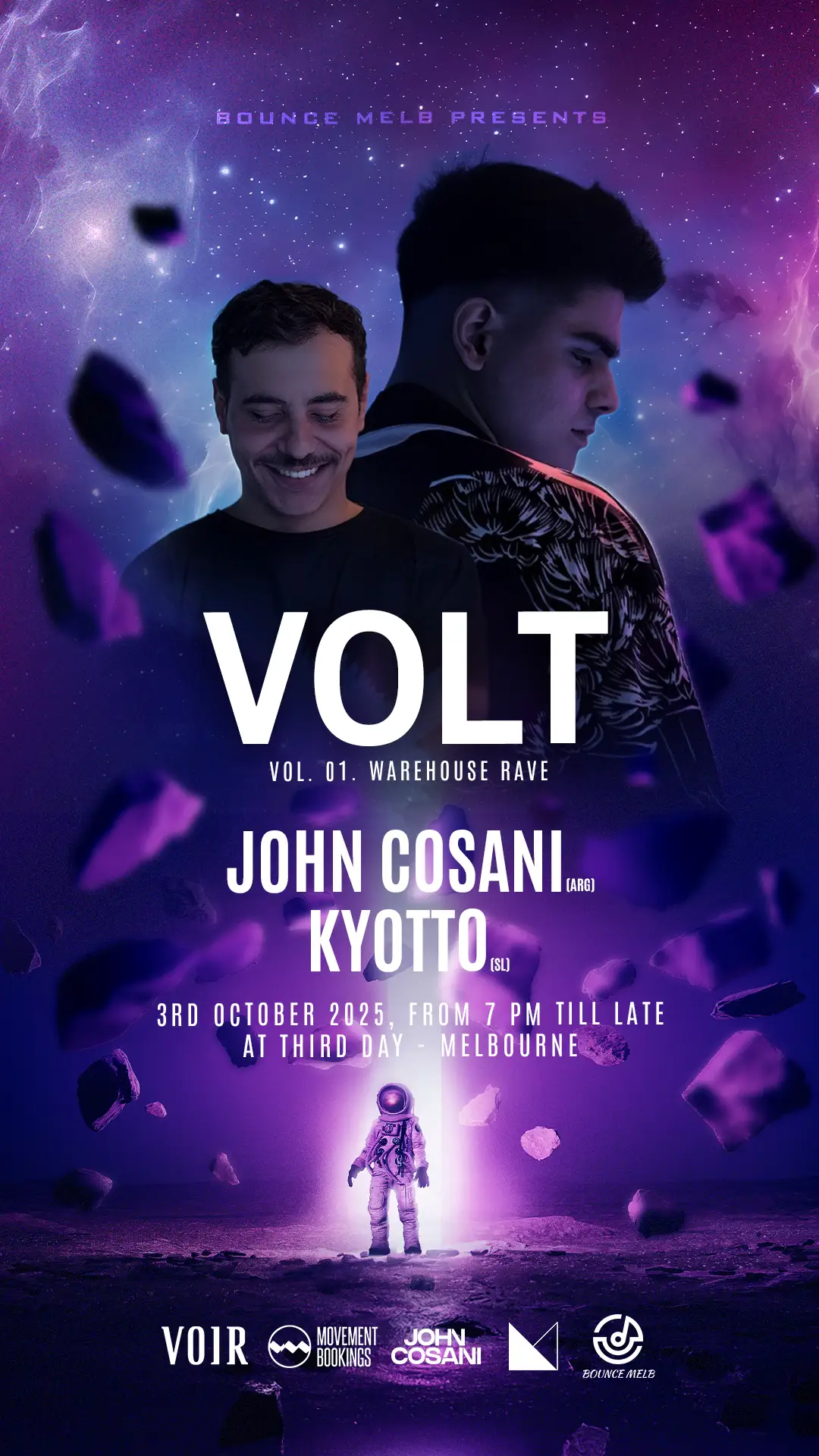 BOUNCE MELB presents "VOLT" (vol.1) : JOHN COSANI (ARG) Debut X KYOTTO (SL) Returns. Get ready to be electrified as our brand new VOLT Series launches with an unforgettable night of progressive house and melodic techno at The Third Day Melbourne. This inaugural event showcases the cutting-edge sounds that define modern underground dance music. Featuring: Kyotto (SL) - RETURNS The Sri Lankan maestro makes his highly anticipated comeback, bringing his signature blend of ethereal progressions and driving basslines that have captivated dance floors worldwide. John Cosani (ARG) Argentina's rising star delivers his distinctively crafted melodic techno, weaving intricate soundscapes that transport listeners on an emotional journey through rhythm and melody. Extended Journey Experience: Each artist will perform a special 3-HOUR EXTENDED SET, allowing for deep musical exploration and seamless progression through the spectrum of progressive house and melodic techno. Witness these masters craft epic sonic narratives across extended timeframes. Event Details: Date: 03 OCT 2025 Time: 7:00 PM onwards Venue: Third Day Melbourne Sounds: Progressive House & Melodic The VOLT Series represents a new chapter in Melbourne's electronic music scene - where extended sets meet exceptional artistry, and where the underground spirit thrives. Join us as we launch this electrifying new series that promises to redefine your AMAZING nights.