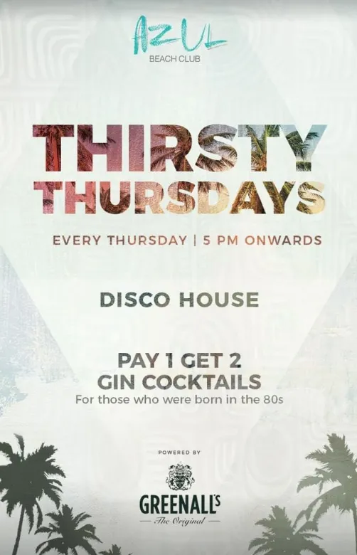 Indulge in "Thirsty Thursdays" at Azul Beach Club every Thursday starting from 5 PM. Immerse yourself in the groovy beats of disco house music while sipping on our special offer: pay for 1 and get 2 gin cocktails. This event is perfect for those who were born in the 80s, bringing back nostalgic vibes and good times.