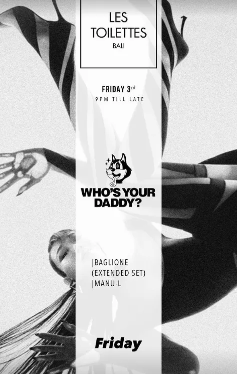 Step into the groove this Friday, May 3rd, 2024, at Les Toilettes Bali for an exclusive DJ night titled "Who's Your Daddy?" The beats kick off at 9 PM and don't stop till late, promising an evening of non-stop musical delight. Embark on a sonic journey with an extended set by Baglione, whose masterful mixing will keep you moving to the rhythm all night long. Joining the lineup is the talented Manu L, adding his unique flair to the mix and ensuring a diverse range of sounds to keep the dance floor alive. With an atmosphere charged with excitement and music pulsating through the air, Les Toilettes Bali is the place to be for an unforgettable night of beats, bass, and boundless energy. Don't miss out on this electrifying event—it's set to be an experience like no other!
