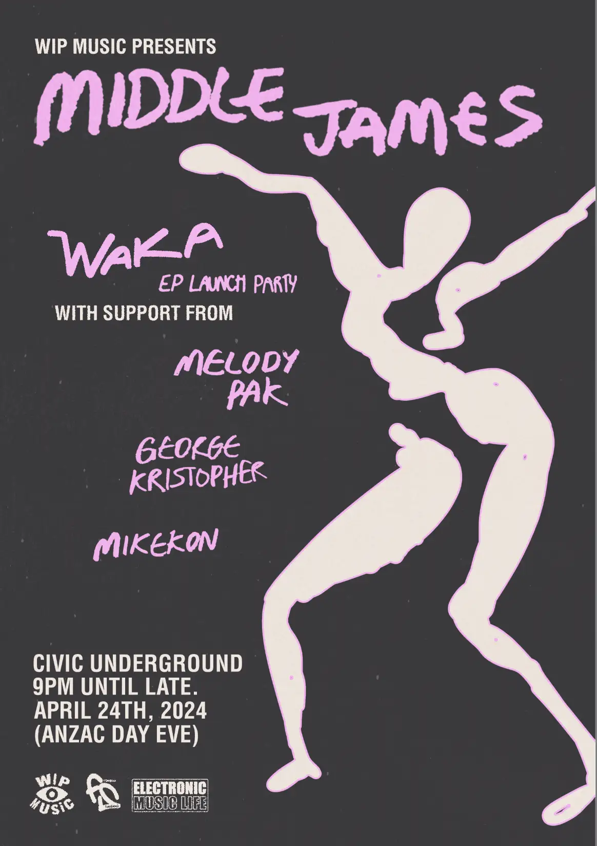 WIP Music are proud to present Middle James at the Civic Underground. Formed in 2022, the pair (Sam Weeks and Connor Mackenzie) have been busy blending improvisational jazz and classical training (Weeks, a Saxophonist and Mackenzie, a pianist) into charging deep house tracks that land somewhere between Coltrane and Chaos in the CBD. Welcoming the duo with the hot EP release "Waka" - this party is a celebration of their musical efforts, sense of community and spirit of dance. This is their first EP dropping on WIP Music with more to come. On support will be Melody Pak & George Kristopher who we also welcome officially to the party, as well as Mikekon returning to close out what looks to be another Dope night in the underground. Special mention to Electronic Music Life + Freedom Sessions for their continued support yet again and always holding it down.